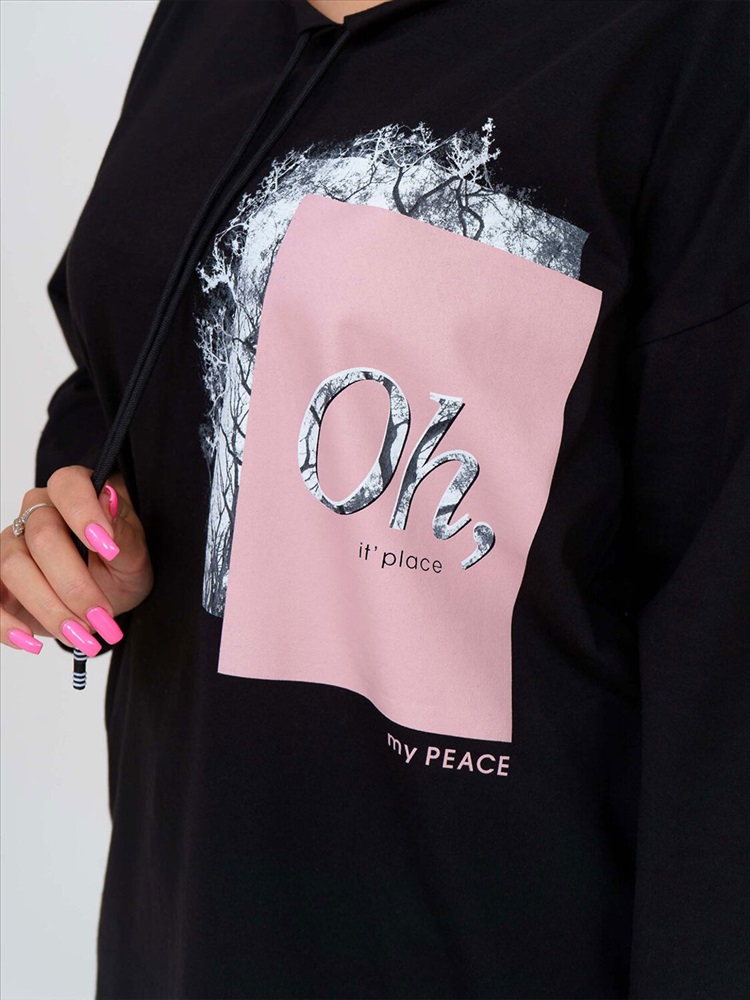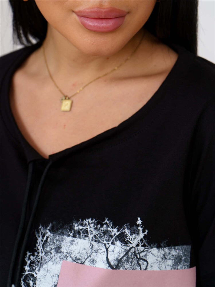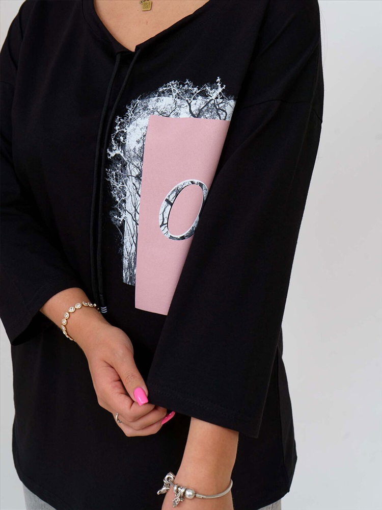 Туника женская, свободного силуэта, длиной чуть ниже уровня бедер, выполненная из качественного трикотажного полотна - кулирка. Вырез горловины V - образный, с регулировкой на шнурке. Рукав - спущенный, длиной 3/4. На передней части стильный принт. Удобная и практичная модель, на каждый день.