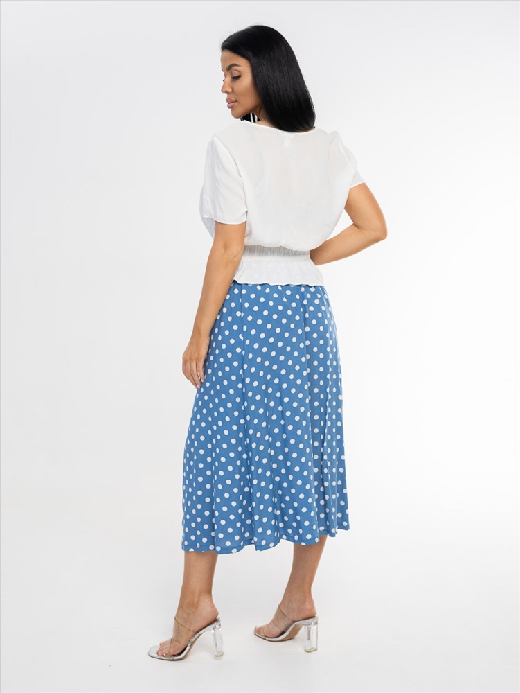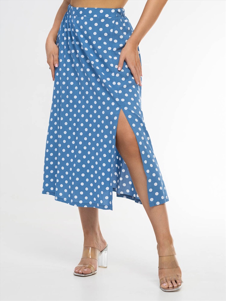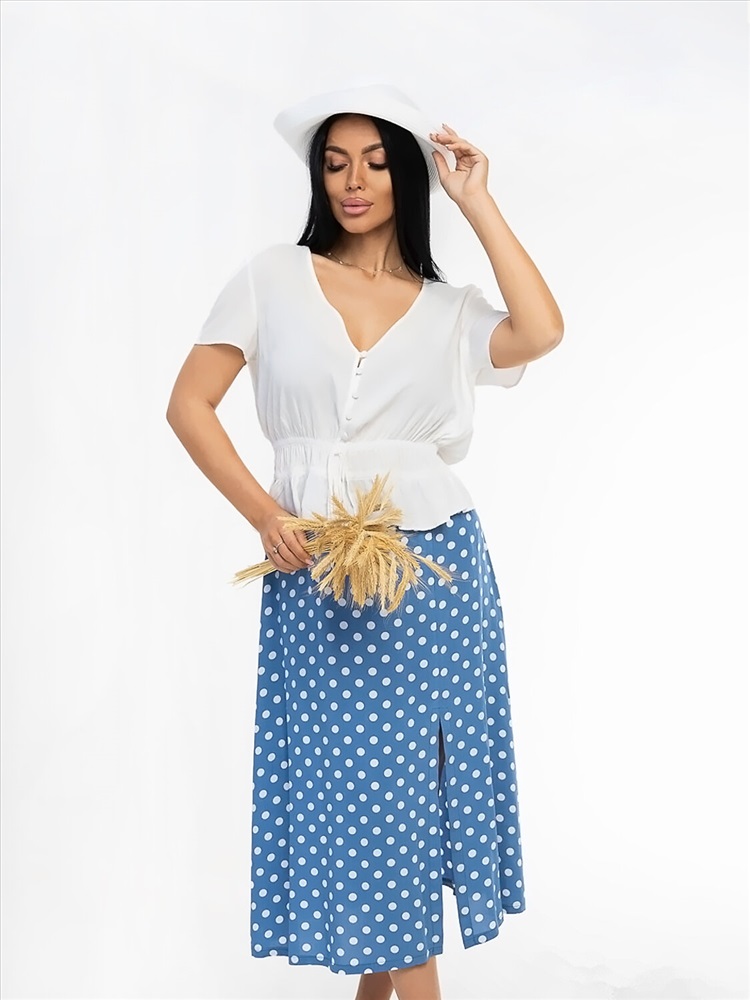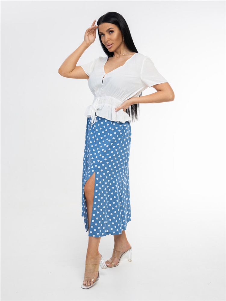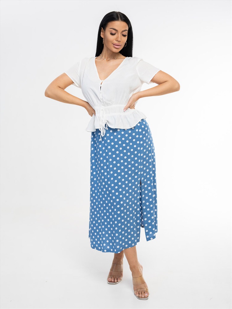 Юбка женская свободного кроя, длиной ниже уровня колена. Данная модель имеет широкий пояс на резинке, для более удобной и надежной посадки, и глубокий вырез на передней части, что придает дополнительную свободу в движении и повышенной комфорт при носке.