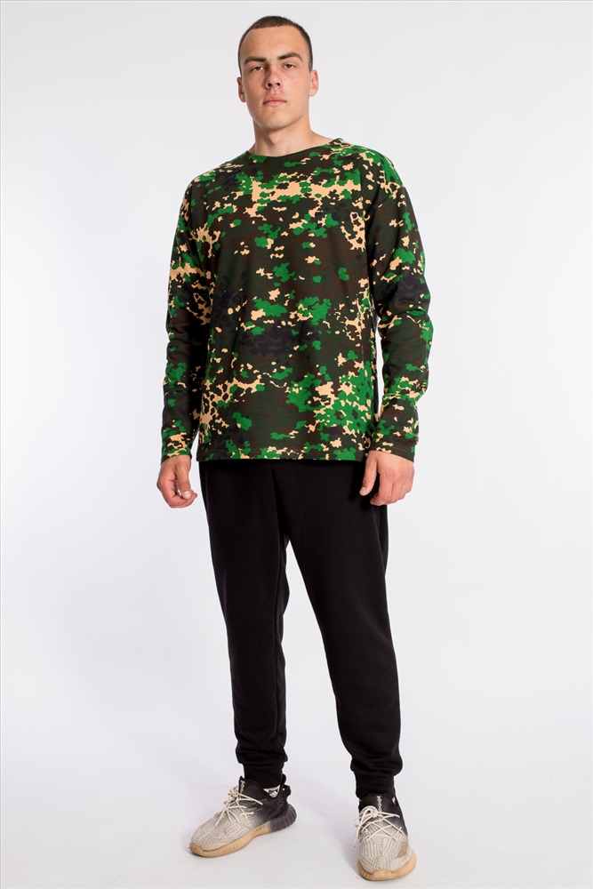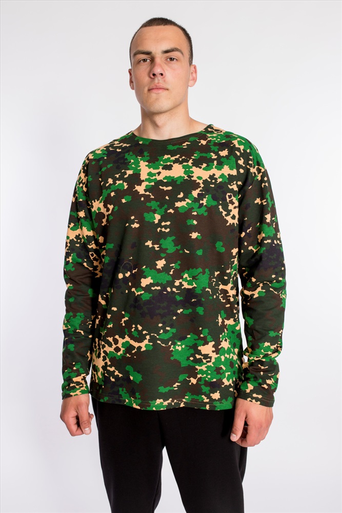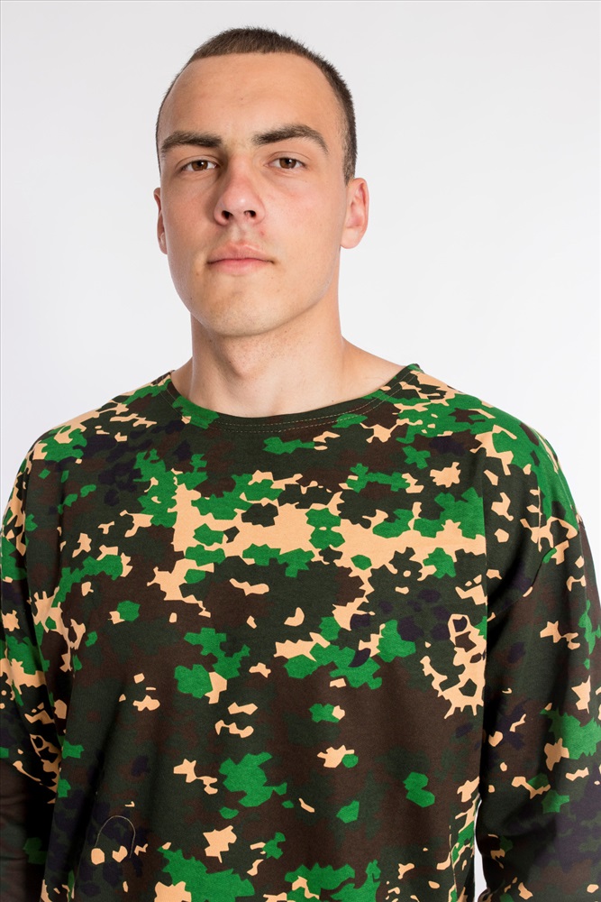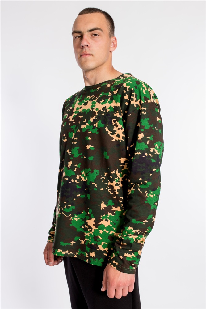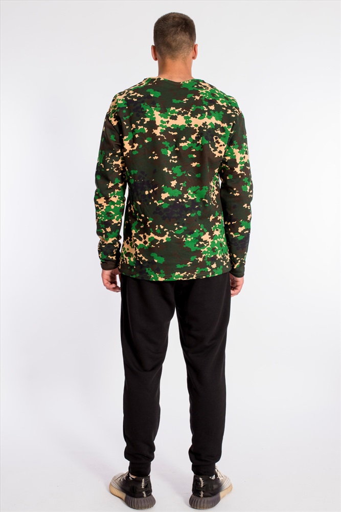 Сезон: Зимний Силуэт: Прямой Состав: Хлопок 80% Полиэстер 20% Цвет Номенклатуры: камуфляж Тельняшка мужская выполнена из полотна с начёсом. Покрой свободный, горловина с круглым вырезом, длинный рукав. Комментарии к товару