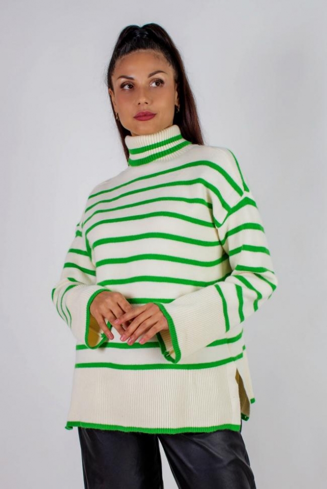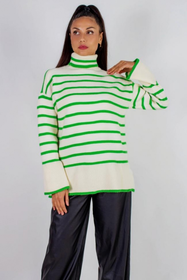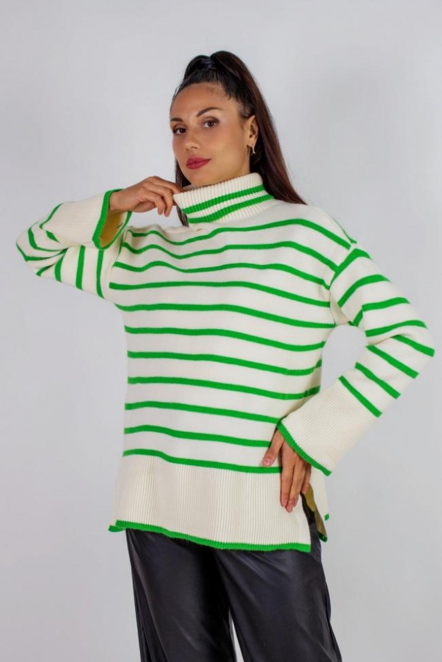 Стильный и уютный джемпер в полоску станет идеальным дополнением вашего гардероба. Изготовлен из качественной акриловой плотной пряжи, джемпер отличается не только своим актуальным дизайном, но и приятными тактильными ощущениями. Он мягкий на ощупь и абсолютно не колется, что сделает его идеальным вариантом для повседневной носки, а также для создания стильных образов в прохладную погоду. Высокое горло джемпера аккуратно смотрится, обеспечивая дополнительный комфорт и защиту от холода. Свободный крой оверсайз и длина обеспечивают максимальный комфорт и свободу движений, скроет возможные недостатки фигуры делая ее более утонченной. Разрезы по бокам добавляют оригинальности и подчеркивают внимание к деталям. Низ, манжеты и горло выполнены из пряжи с одинаковой вязкой, что создает гармоничный и завершенный образ. Такой джемпер отлично сочетается как с лосинами, джинсами и брюками, так и с юбками, что делает его универсальным решением для разных случаев - от офисных будней до уютных встреч с друзьями. Доступный в актуальном оверсайз-формате, он хорошо подходит для размеров 44-52, обеспечивая модный вид на любой фигуре. Следует отметить что чем больше Ваш размер, тем менее будет выражен эффект оверсайз. При правильном уходе (режим ручная стирка и горизонтальная сушка) вы сможете оценить его износостойкость. Не упустите возможность пополнить свой гардероб этим джемпером, который будет радовать вас своим качеством и стилем не один сезон. Рост модели на фото: 175 см, размер: 46-48. На ней представлен джемпер в едином размере 44-52
