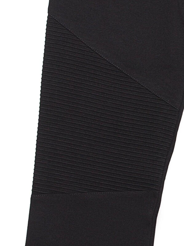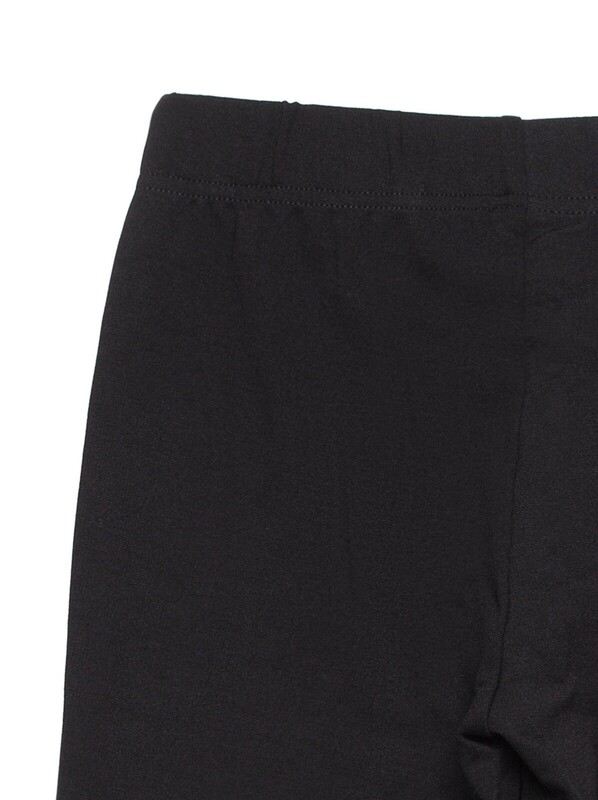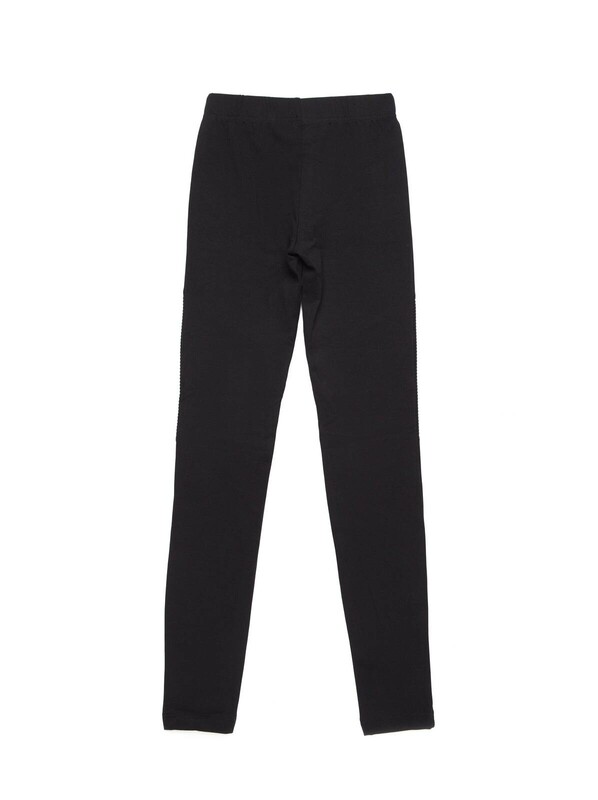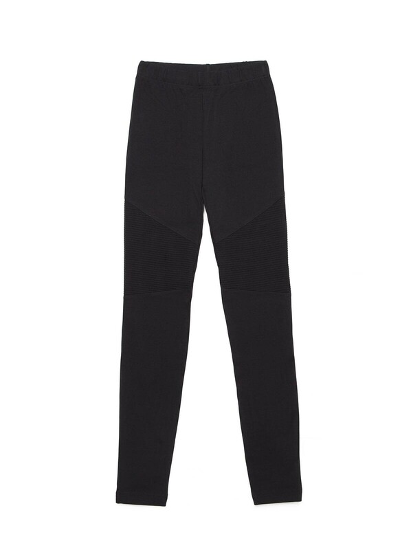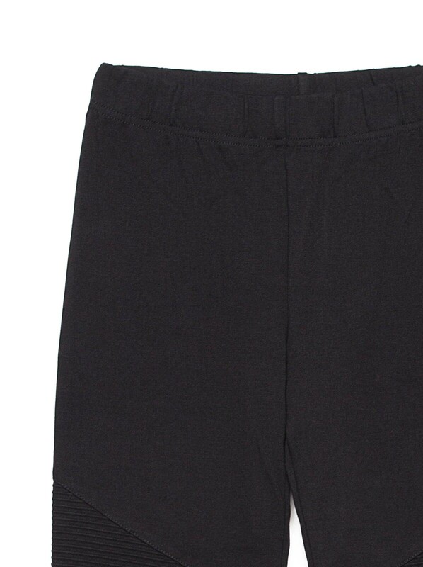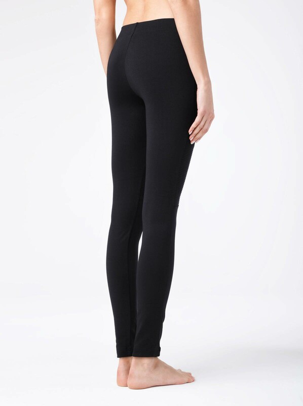 Леггинсы женские из трикотажного полотна. По передним половинкам на уровне колена отделочная деталь из отделочного трикотажного полотна. Верх изделия обработан широкой резинкой швом в подгибку. По швам притачивания отделочной детали, шву притачивания пояса выполнена отделочная строчка.