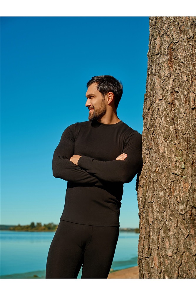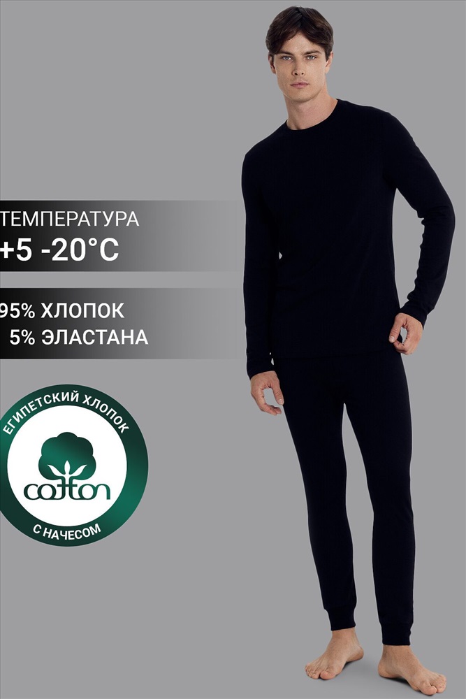 Фуфайка мужская на базе 721466 для спорта и отдыха изготовлен из трикотажного полотна-ЭКО-хлопок с эластаном (теплое белье). Силуэт прямой. Длина до середины бедер. Горловина с притачной обтачкой. По горловине проложена декоративная строчка на 0,2 мм (по изделию). Вырез круглый. Перед и спинка цельнокроенные. Рукава втачные одношовные длинные. Боковые швы распошиты на плоскошовной машине. Низ рукавов и изделия застрочены швом вподгиб на 2-хигольной плоскошовной машине. Кальсоны мужские на базе 741209 из трикотажного полотна (хлопок, эластан), плотно облегающие бедра и ноги по всей длине. На передней части усилительная планка и подкладка из 2 частей. Задняя часть со средним швом. Верхний край с эластичной фирменной трикотажной жаккардовой тесьмой, настроченной вкруговую на 2-хигольной плоскошовной машине с роликами. Нижние срезы с притачными манжетами Цвет 1 - все детали
