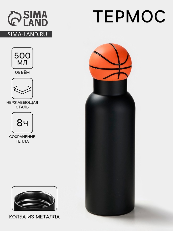 Термос 500 мл с сохранением тепла 8 часов — прочный и лаконичный спутник для тех, кто в движении. Чёрный корпус с крышкой в стиле баскетбольного мяча, универсальный дизайн и надёжная термоизоляция делают его практичным выбором для школы, тренировок, поездок и повседневных выходов.