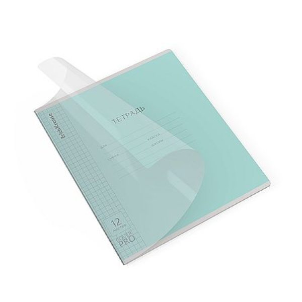 Тетрадь школьная ученическая формата А5+ (170x203 мм). Двойная обложка: внешняя выполнена из высококачественного износостойкого прозрачного пластика с фактурой «апельсиновая корка», внутренняя — из качественной мелованной бумаги. В блоке 12 листов в клетку. Бумага офсетная плотностью 60 г/м2. Цвет линовки — синий. Скругленные уголки обложки и блока. Тип скрепления — скоба. Тетради упакованы в термоусадочную пленку по 10 штук.