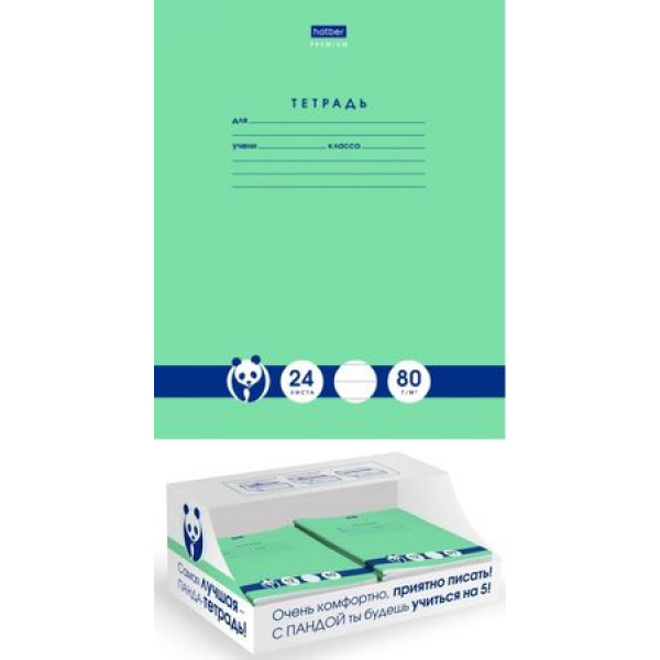 Тетрадь А5 формата 24 листа.Обложка: мелованный картон. Внутренний блок: офсет 80 гр., линия, красные поля.Скрепление: скоба. Зеленые тетради классического дизайна, дополненные милым изображением панды, не оставят равнодушным ни одного школьника. Блок повышенной плотности и гладкости идеально подходит для всех видов пишущих принадлежностей, включая гелевые, капиллярные и перьевые ручки: написанное на одной стороне не просвечивает на другой. Внешний вид тетрадей надолго сохранит свою привлекательность за счет скругленных уголков. Внутренний блок с четко прорисованными полями и линовкой соответствуют высокому качеству полиграфии. Тетради упакованы в картонную транспортную коробку. На ней имеется перфорация для частичного отрыва верхней крышки, за счет которой коробка без особых усилий превращается в удобный шоу-бокс для выкладки тетрадей на полках магазинов.ТМ Hatber
