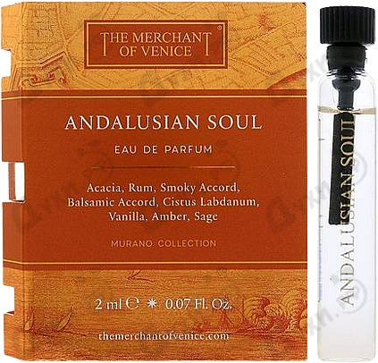 Andalusian Soul — селективная парфюмерная вода с восточным ароматом для женщин и мужчин, представленный в 2018 году итальянским парфюмерным брендом The Merchant Of Venice. Роскошный королевский аромат Andalusian Soul (Андалусская душа) вдохновлен великолепной красотой природы южной испанской провинции Андалусии, его старинной богатой историей, удивительной архитектурой и который является одним из превосходных унисекс парфюмов элитного, старинного венецианского парфюмерного бренда. Коллекция эксклюзивных ароматов облачена в дорогие дизайнерские стеклянные флаконы ручной работы. Парфюмерная композиция Andalusian Soul изысканно составлена из нежных пряных оттенков цветков шалфея, теплых соблазнительных пудровых нот ванили, ярким жгучим интригующим аккордом крепкого солнечного рома, глубоких дымных древесно-амбровых акцентов ладана, смолистых оттенков янтаря и медовых манящих цветочных нот акации. Комментарии к товару
