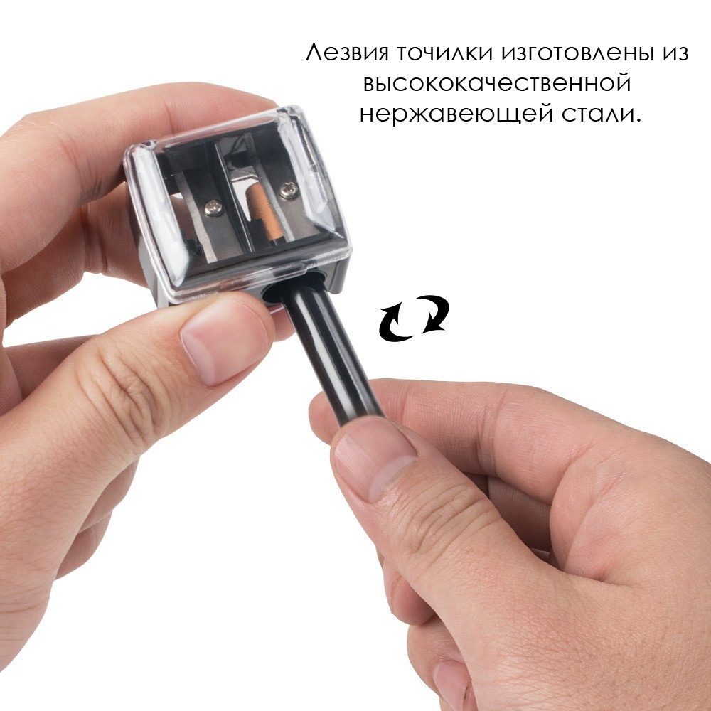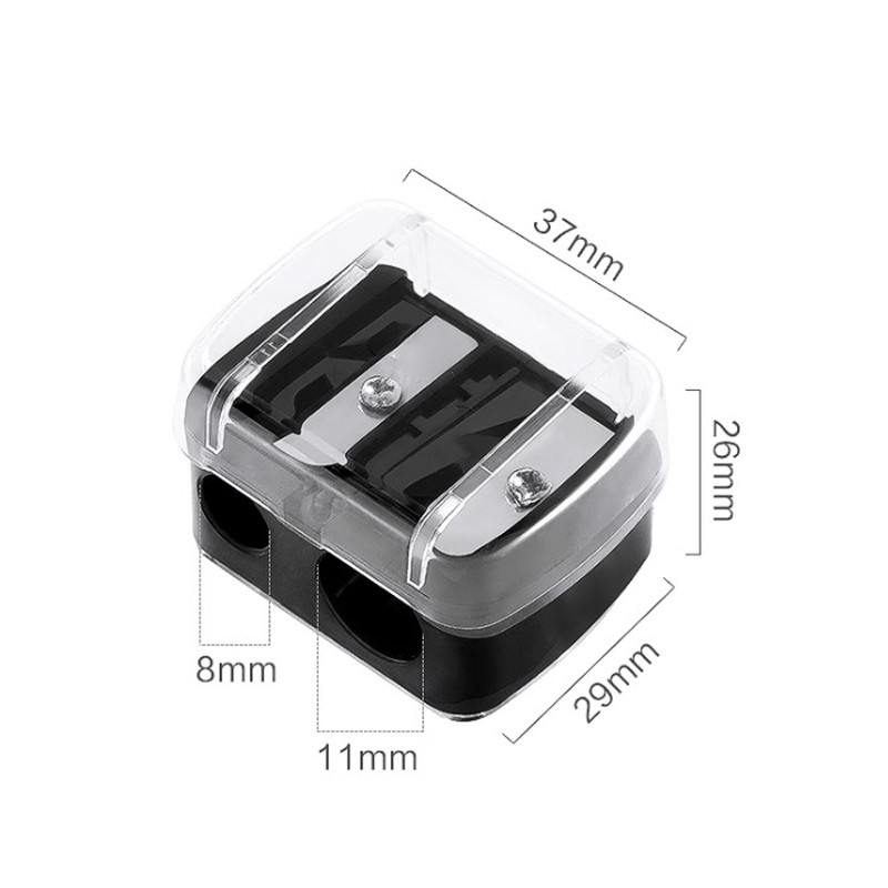 Универсальная точилка для косметических карандашей с 2 отверстиями разного диаметра (8 мм. и 12 мм.) с полупрозрачным колпачком и прочным стиком для очистки лезвий. Способ применения: Вставьте карандаш в подходящий разъем. Плавно поворачивайте карандаш, пока не получите нужную остроту. Стружка останется в контейнере – просто выбросьте её и закройте крышку. Комментарии к товару