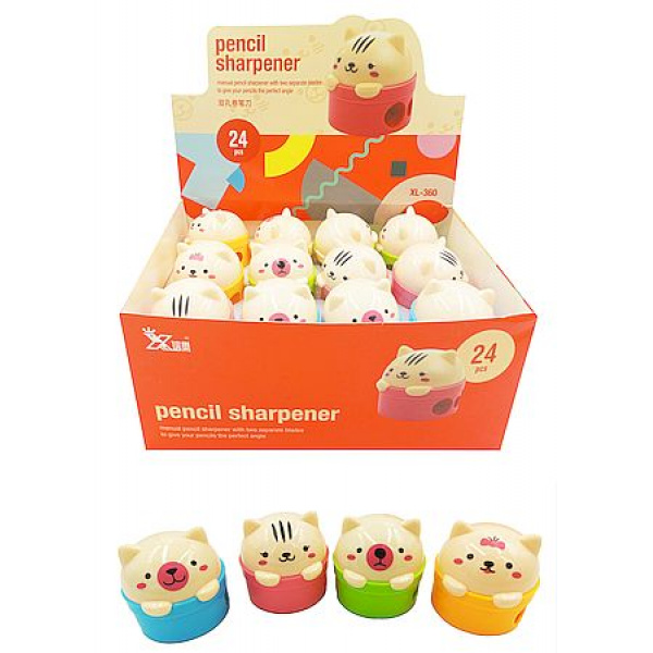 Точилка пластиковая Centrum "Котики". Два отверстия рассчитаны для затачивания стандартных и утолщенных трехгранных, шестигранных, круглых, чернографитных и цветных пластиковых и деревянных карандашей. Острое лезвие из высококачественной стали производит быструю и точную заточку, не оставляя срезов и следов повреждения. Имеется контейнер для стружки. Дизайн в ассортименте.