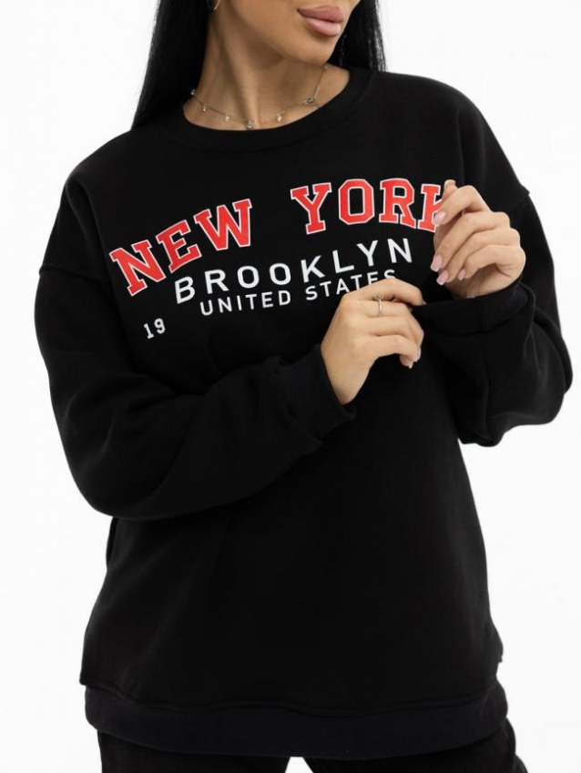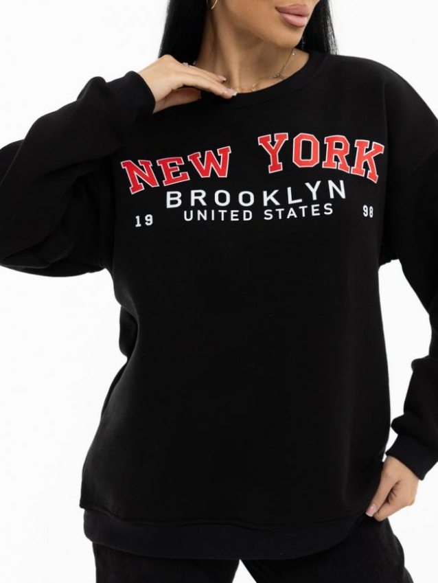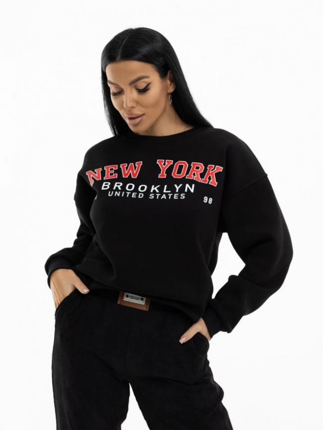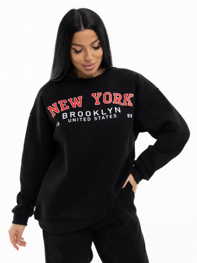 Толстовка женская из футера с начесом, О-образная горловина, длинный рукав, длина до середины бедра. Горловина, манжена и пояс толстовки выполнен из кашкорсе. Спереди износостойкий принт.
