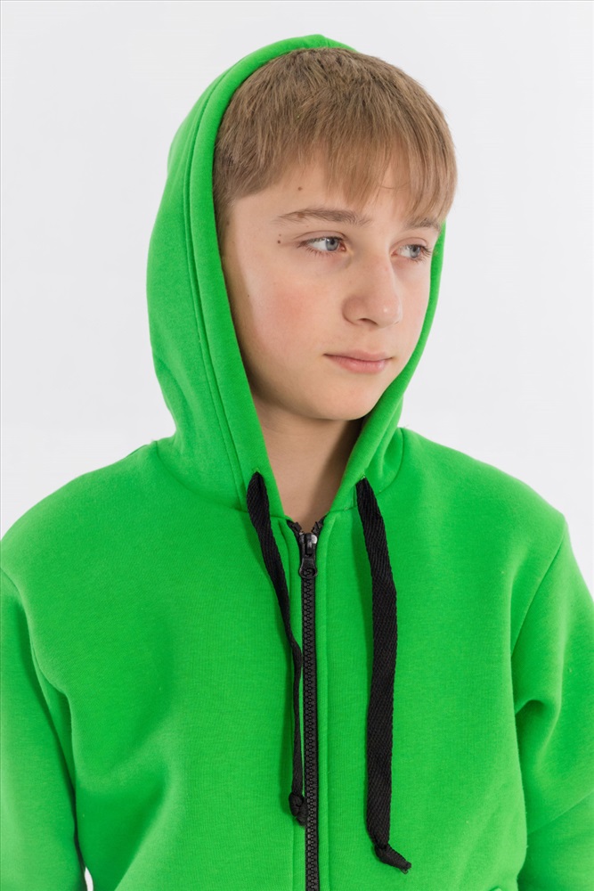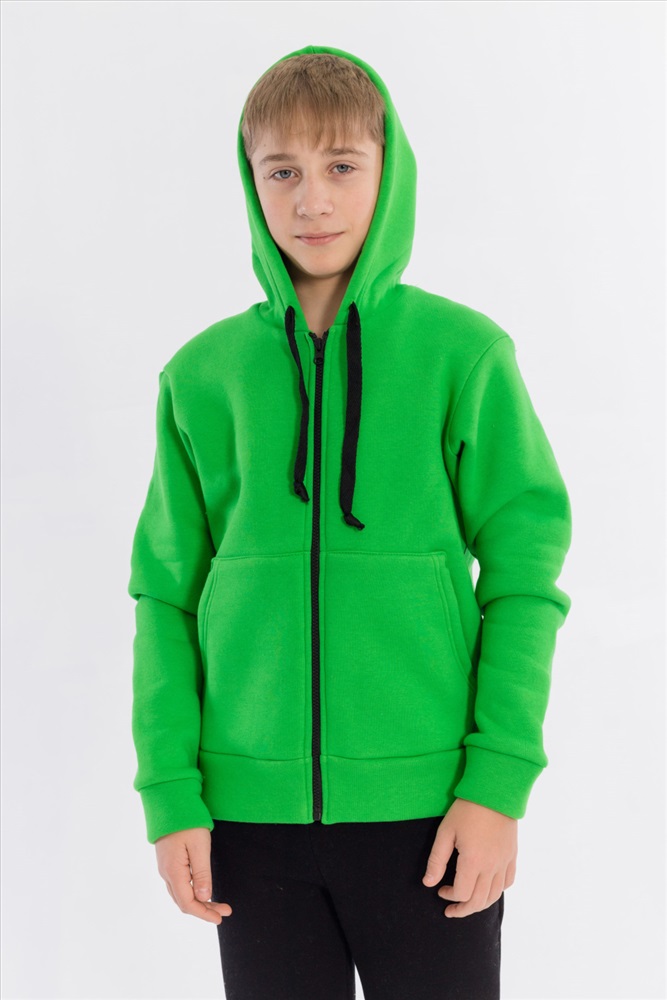 Толстовка выполнена из однотонного футера трёхнитки (начёс). Спереди с застёжкой на молнию и карманами. Ширина капюшона регулируется при помощи шнура, манжеты рукавов и пояс толстовки из основного полотна.