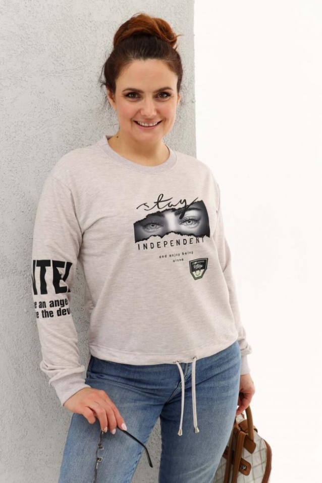 Толстовка оверсайз - трендовая модель, которая прекрасно впишется в любой модный лук. Толстовка длинной до середины бедра по полочке и удлиненной спинкой, со спущенной линией плеча. Стильная черно-белая печать. Манжеты и горловина из кашкорсе в тон ткани. Низ изделия регулируется кулиской.