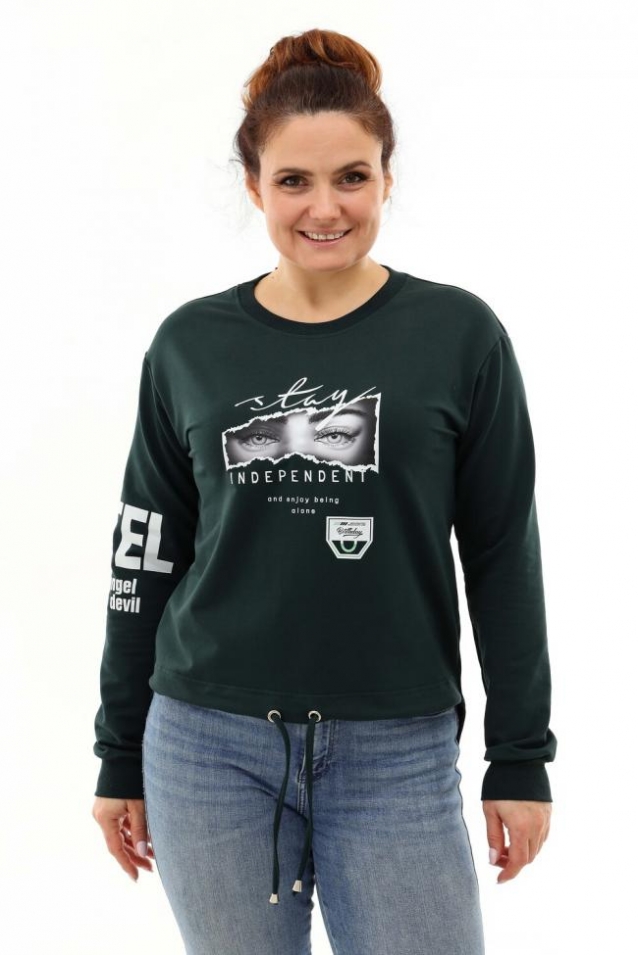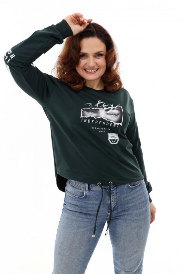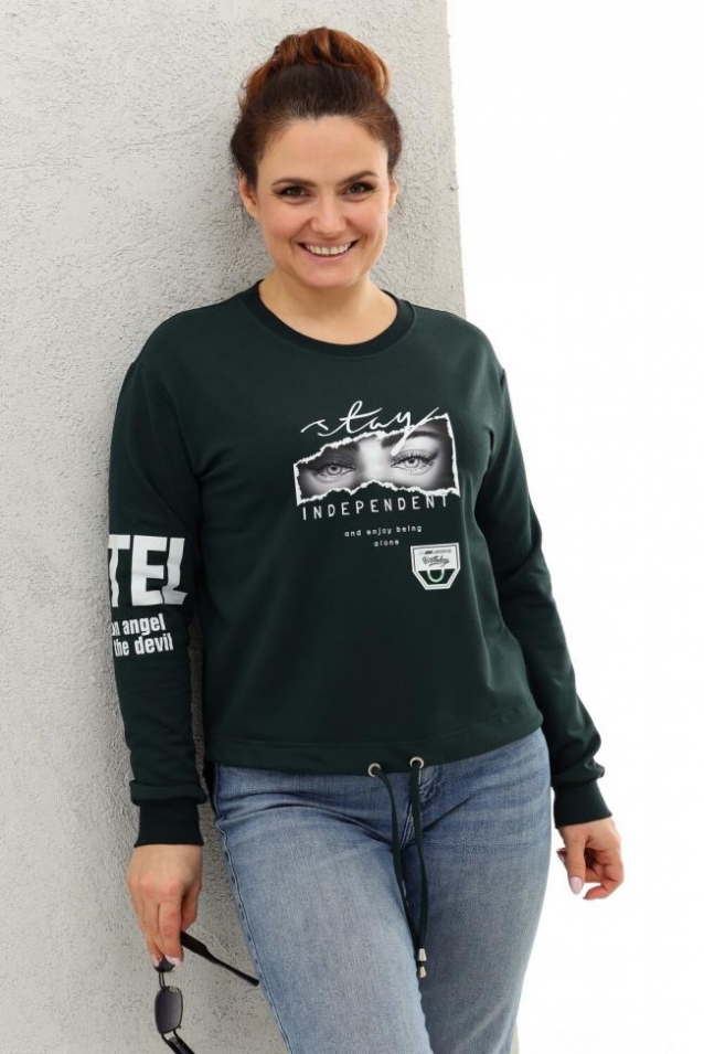Толстовка оверсайз - трендовая модель, которая прекрасно впишется в любой модный лук. Толстовка длинной до середины бедра по полочке и удлиненной спинкой, со спущенной линией плеча. Стильная черно-белая печать. Манжеты и горловина из кашкорсе в тон ткани. Низ изделия регулируется кулиской.