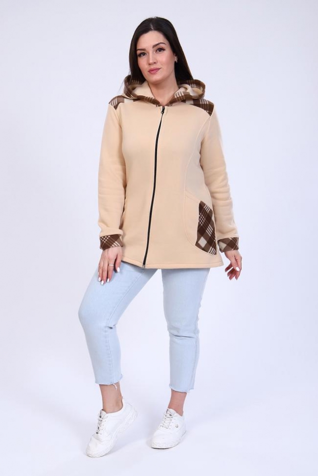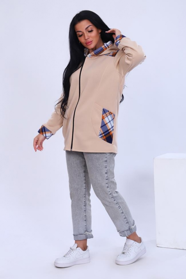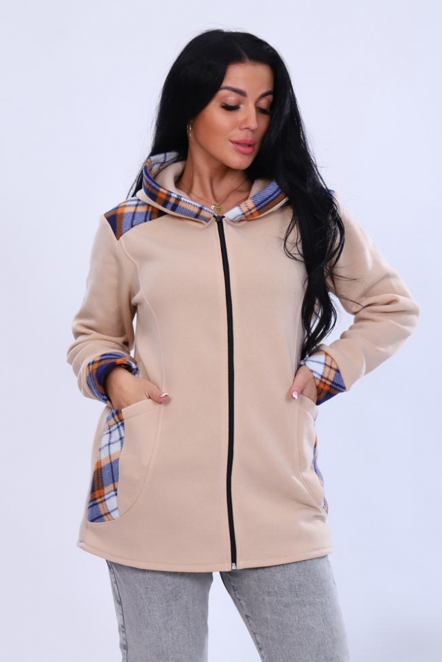 Толстовка женская утепленная на молнии с капюшоном. Длинный рукав на манжете, на передней полочке рельефы, в которых расположены карманы. Практично и удобно. В бежевой й расцветке возможны вставки коричневого и рыжего цветов.