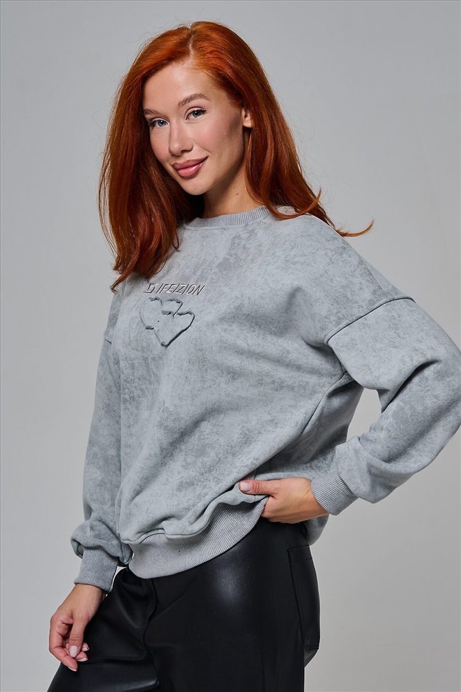 Толстовка женская оверсайз с вышивкой на полочке. Горловина, пояс, манжеты из кашкорсе в цвет основной ткани. Вверху по центру спинки - элемент в виде сердца.