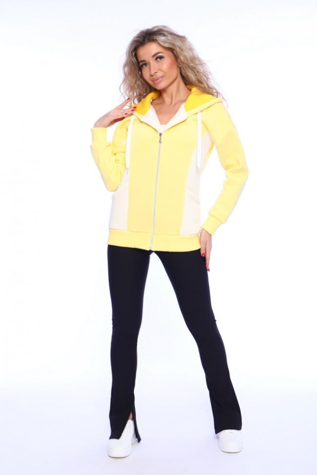 Стильная толстовка с капюшоном выполнена из качественного футера 3-нитки с начёсом . Манжеты снизу и на рукавах из кашкорсе ,спереди вертикальная молния.