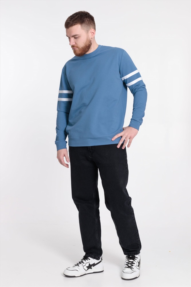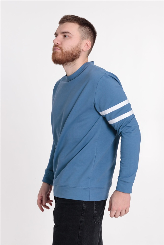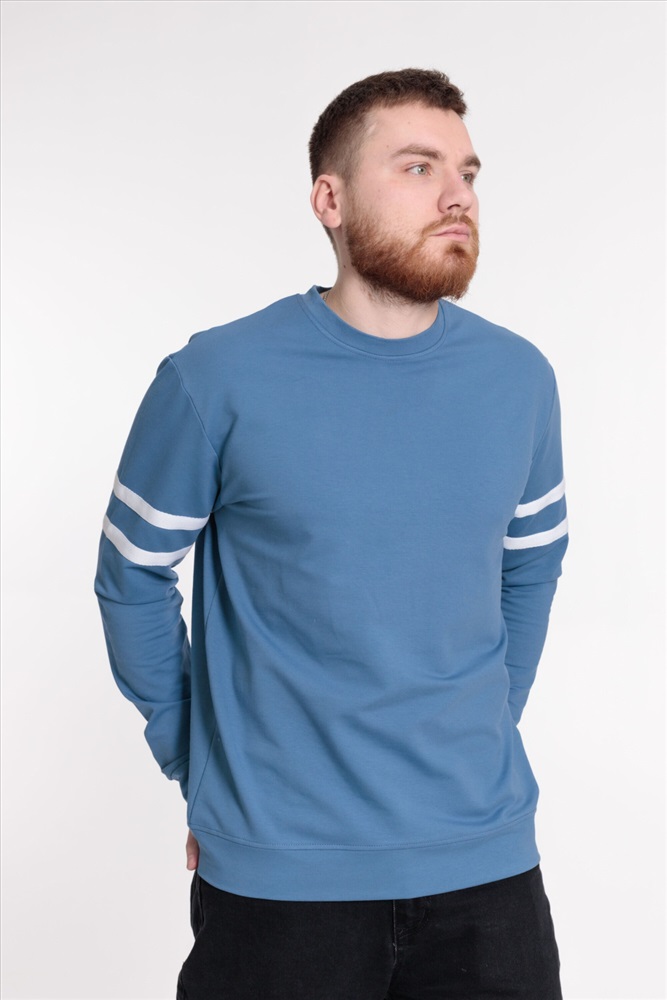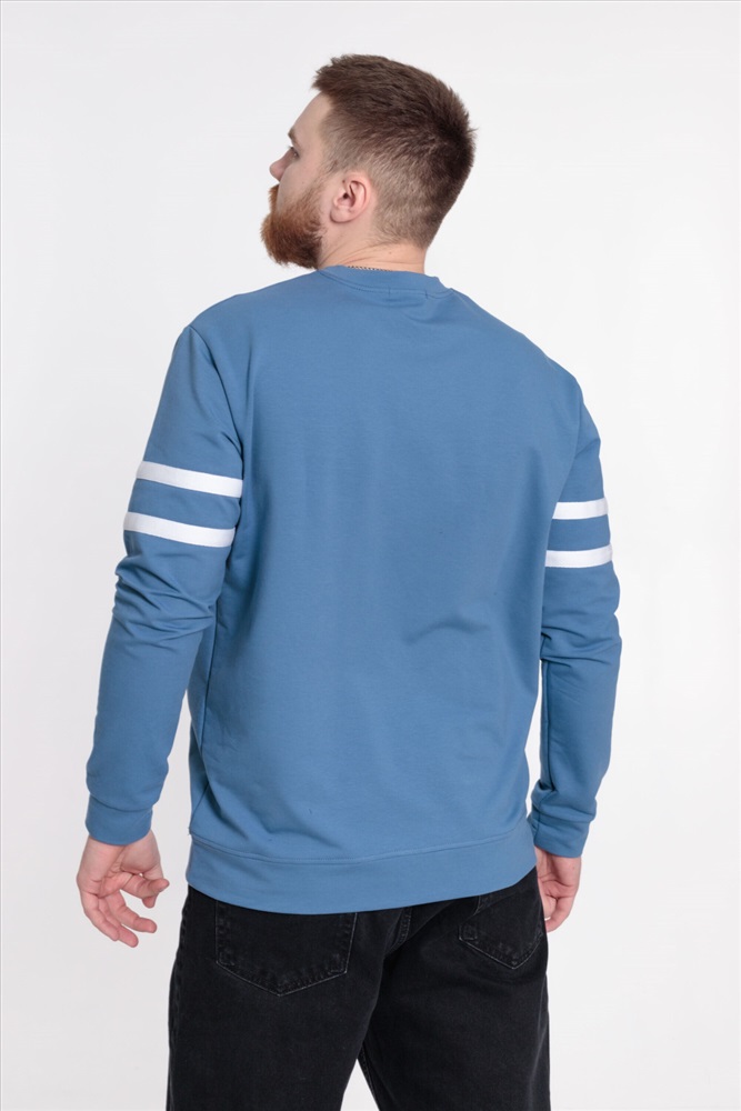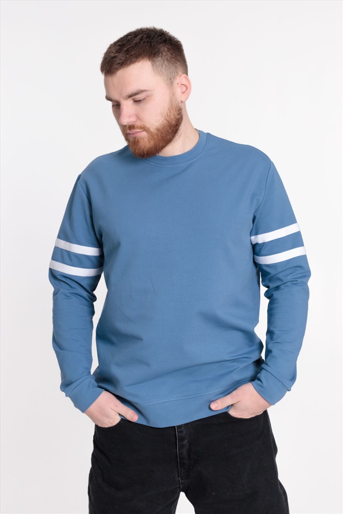 Застежка: Без застежки С капюшоном: Нет С карманами: Нет Сезон: Всесезонный Силуэт: Прямой Состав: Хлопок 95% Лайкра 5% Цвет Номенклатуры: индиго Толстовка мужская прямого силуэта, с лёгким оверсайз эффектом. Круглый вырез горловины оформлен планкой, на рукавах отделочные полосы. Манжеты длинных втачных рукавов и пояс из основной ткани. Комментарии к товару