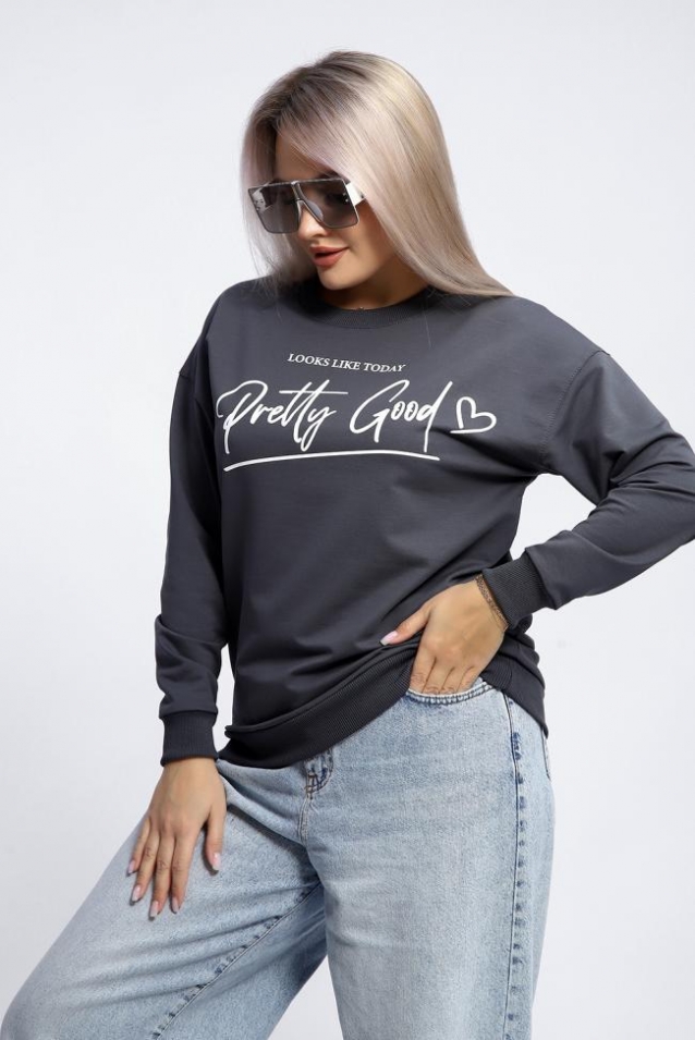 Толстовка свободного кроя оверсайз со спущенной линией плеча прекрасный вариант для прохладной погоды! Мягкое, эластичное кашкорсе в тон ткани использовано для отделки горловины, манжет и пояса. На полочке декоративный принт.
