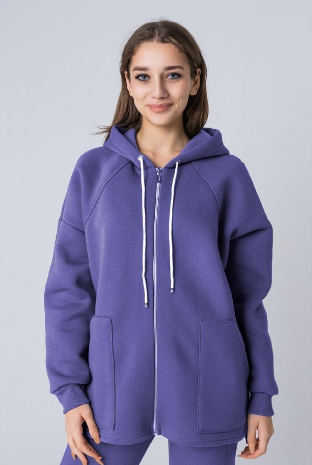 Толстовка утепленная, прямая, свободная, на молнии, с удлиненной спинкой, с капюшоном. Рукав длинный, на эластичном манжете. Полочка и спинка с фигурными кокетками. В нижней части полочки расположены удобные накладные карманы.