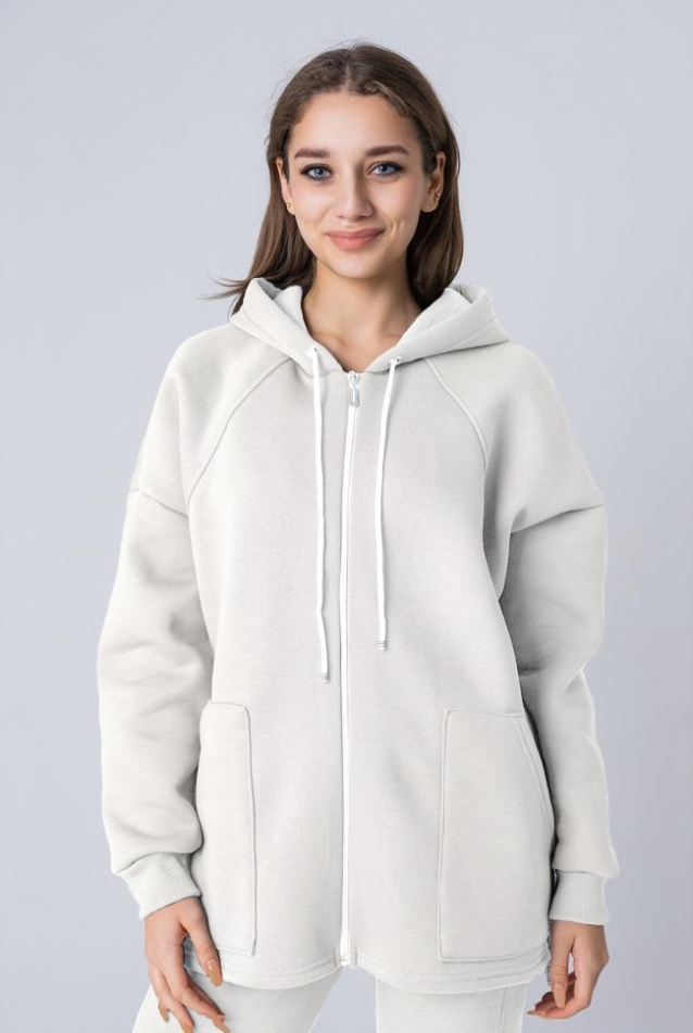Толстовка утепленная, прямая, свободная, на молнии, с удлиненной спинкой, с капюшоном. Рукав длинный, на эластичном манжете. Полочка и спинка с фигурными кокетками. В нижней части полочки расположены удобные накладные карманы.