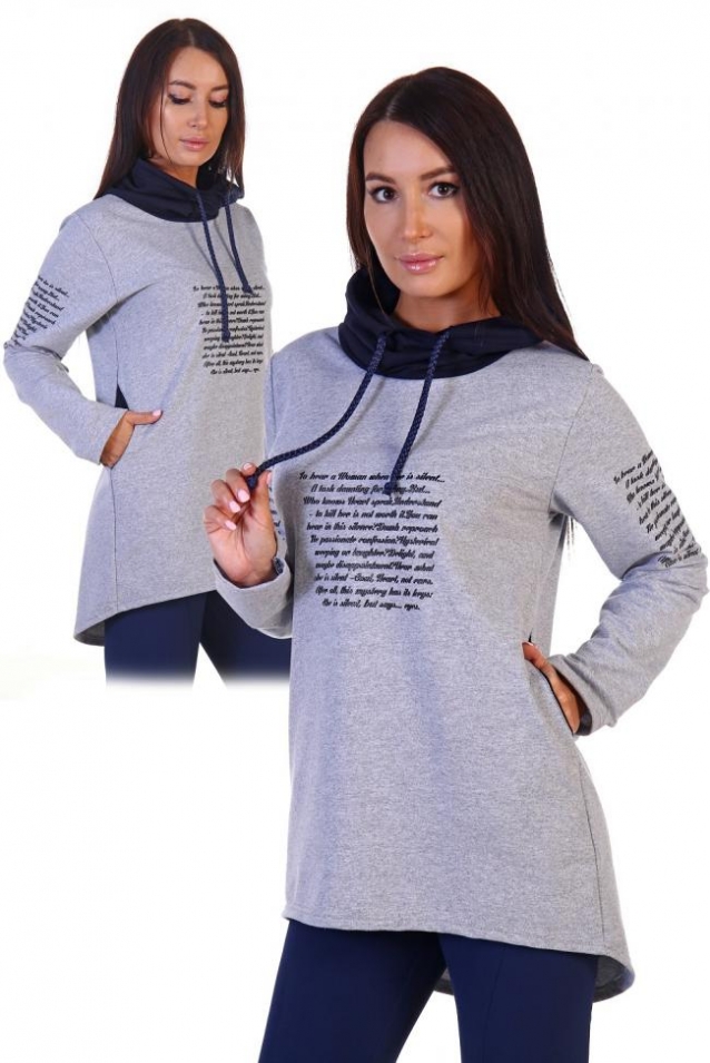 Стильная толстовка из футера с лайкрой. Воротник-хомут со вдетым шнурком, принт в виде надписей спереди и на рукавах. Две расцветки серая и темно-синяя. Размеры от 42 до 56. Возможен заказ в розницу.