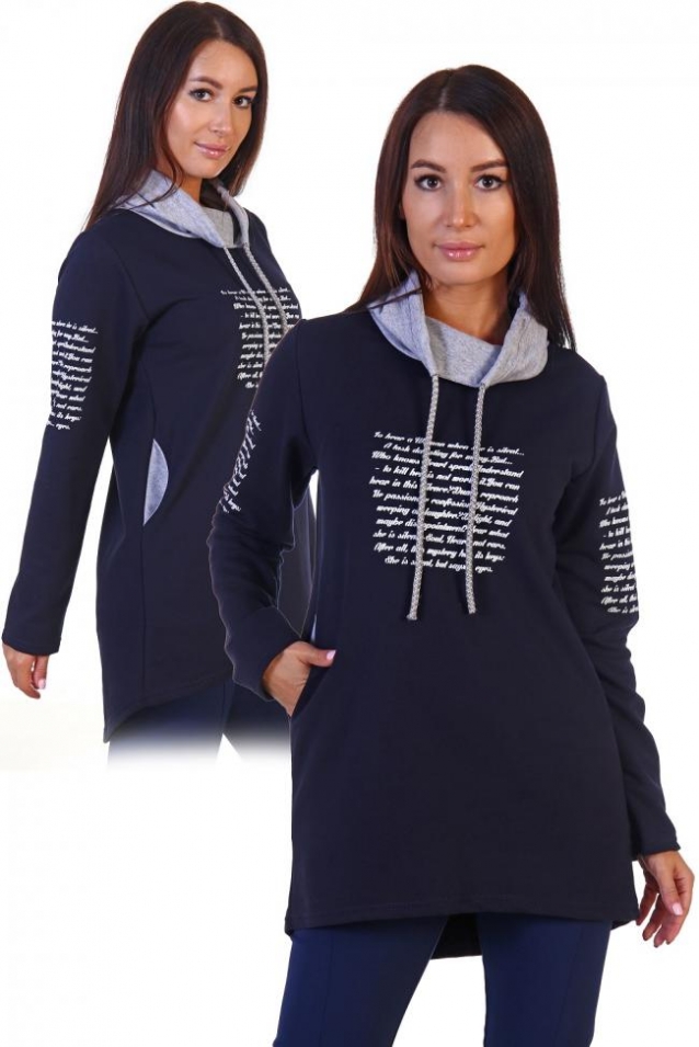 Стильная толстовка из футера с лайкрой. Воротник-хомут со вдетым шнурком, принт в виде надписей спереди и на рукавах. Две расцветки серая и темно-синяя. Размеры от 42 до 56. Возможен заказ в розницу.