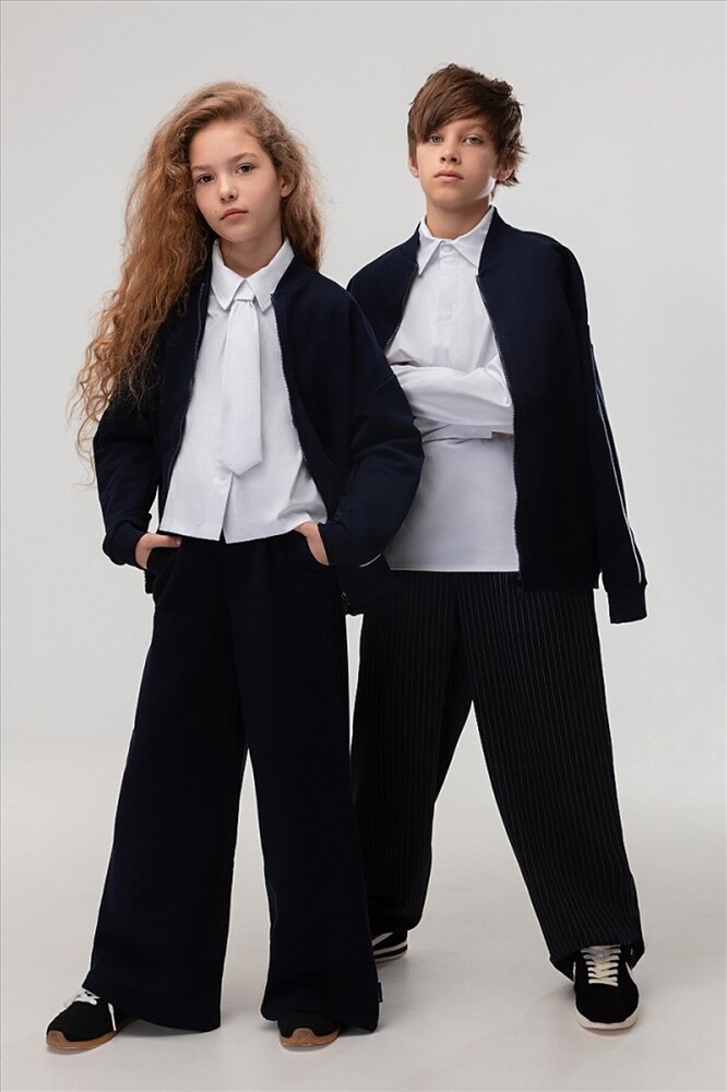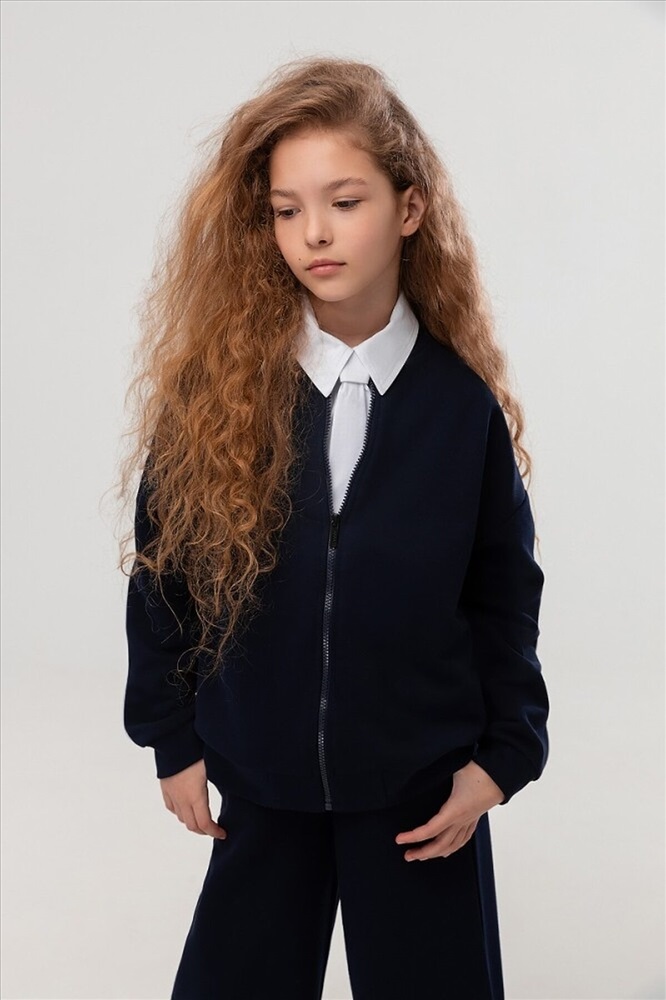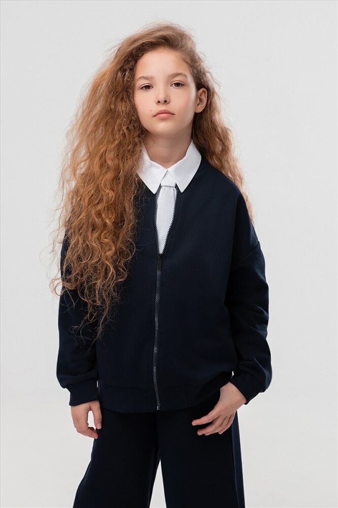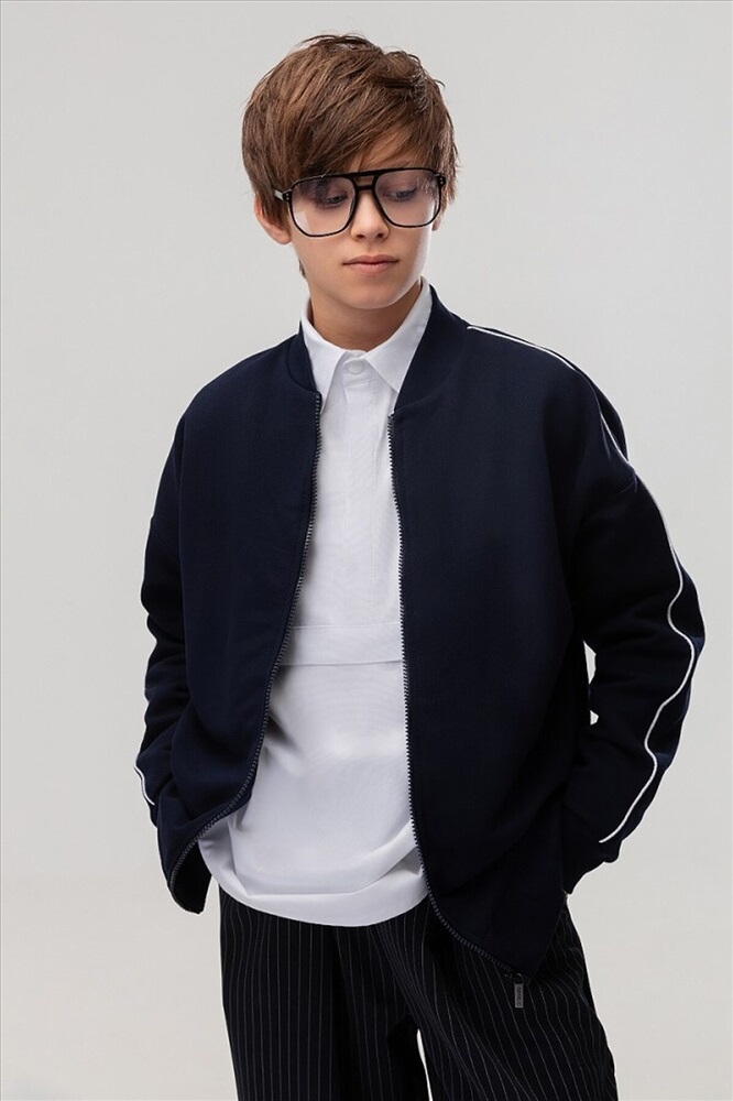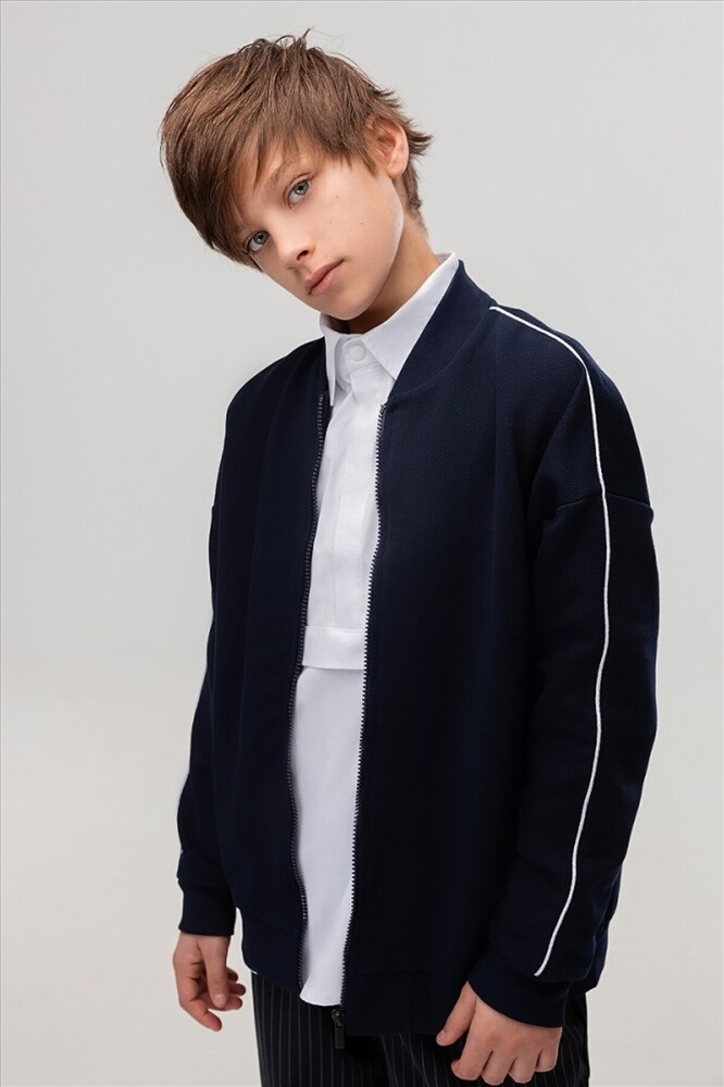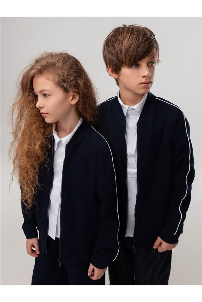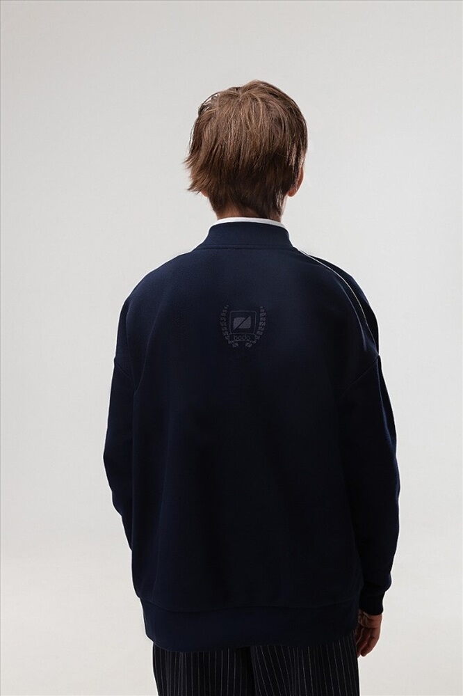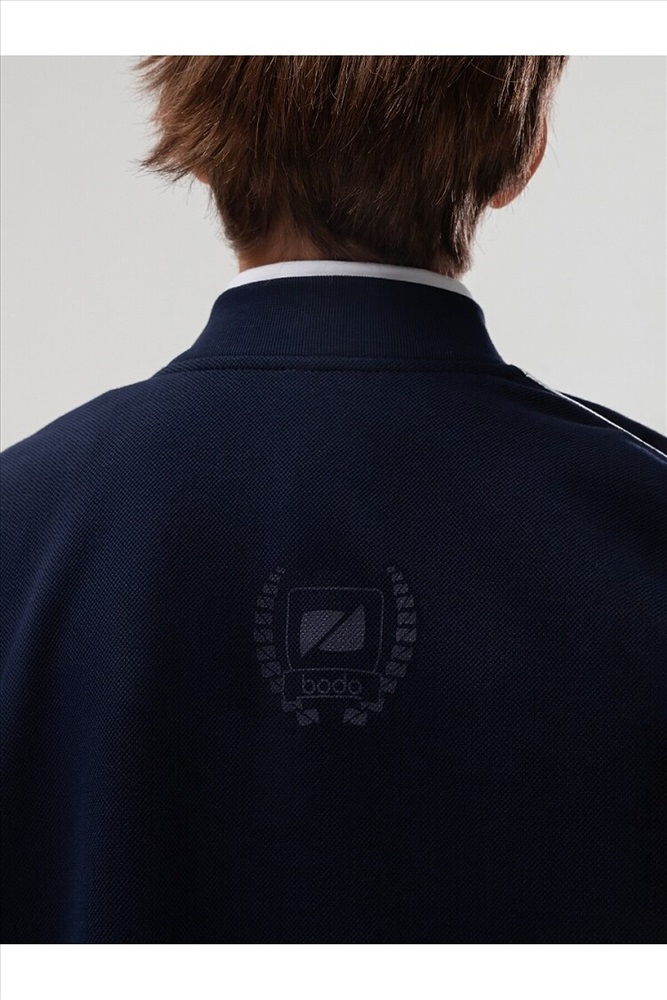 Толстовка из материала пике на молнии, без карманов. По шву атласный белый кант, на левой стороне брендированный принт герба.
