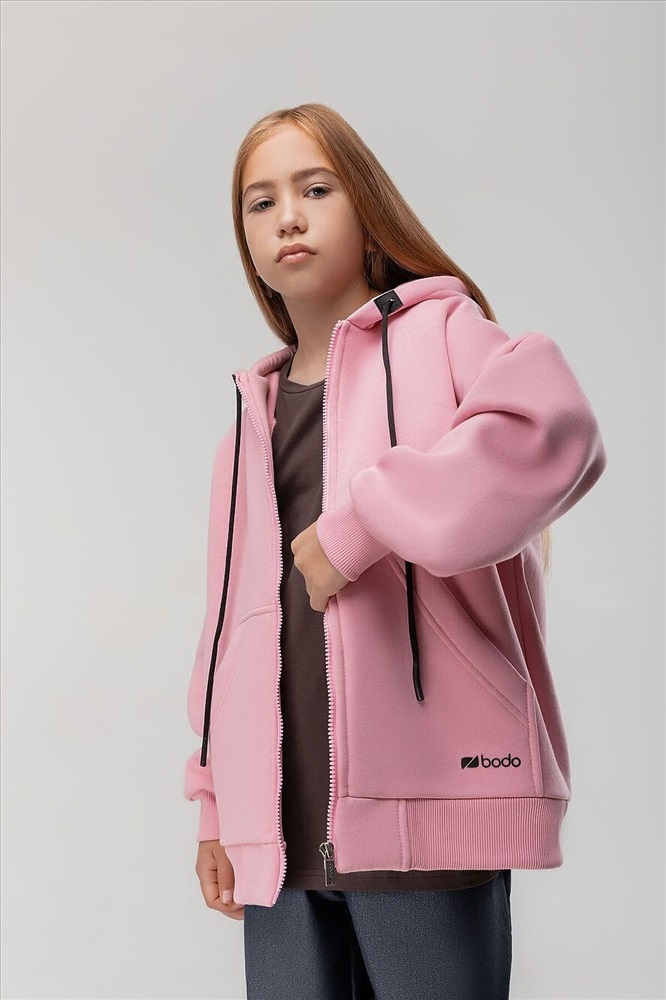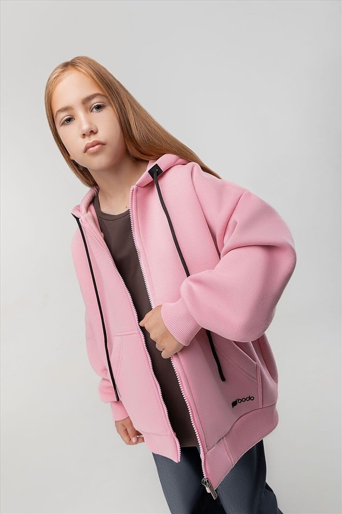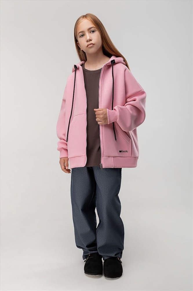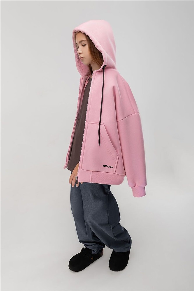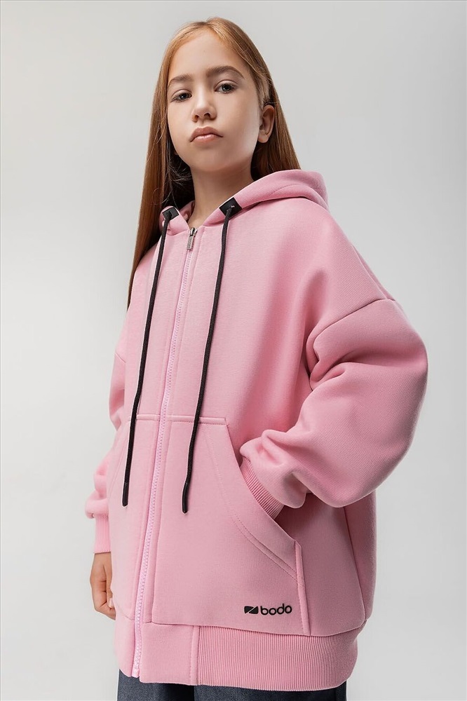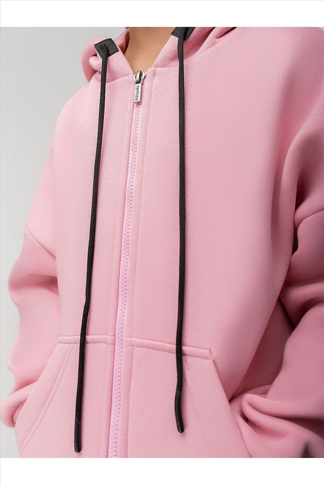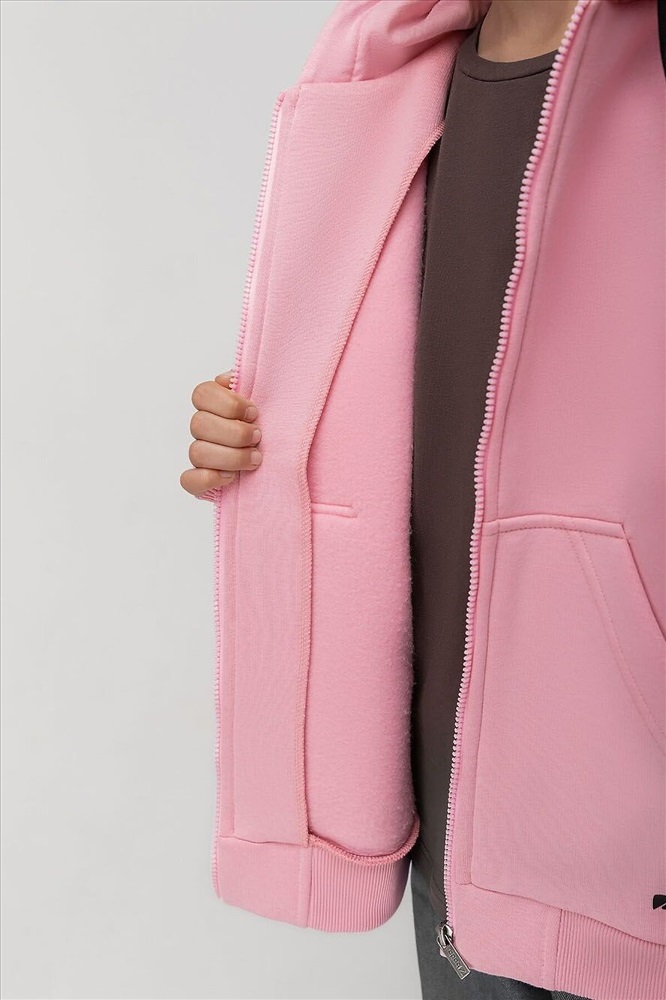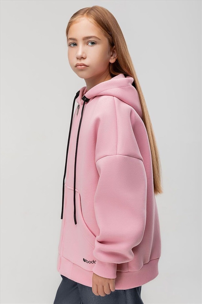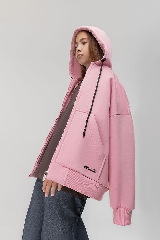 Прямая толстовка на молнии с начесом. Толстовка с капюшоном, со спущенным плечом, рукава с манжетой и пояс по низу. На полочке располагается карман «кенгуру».