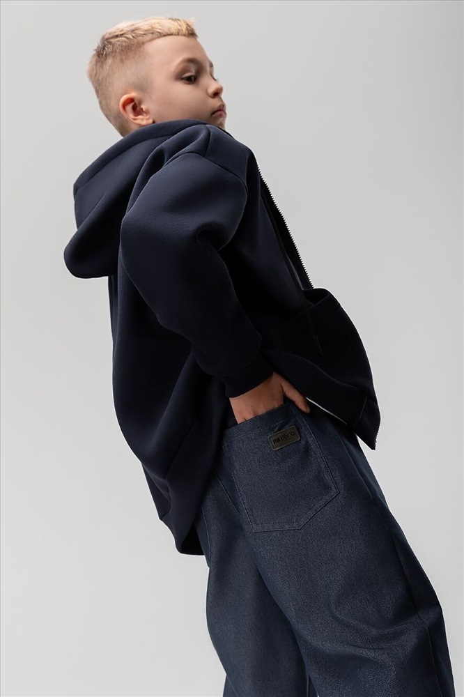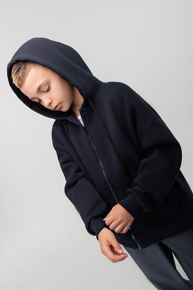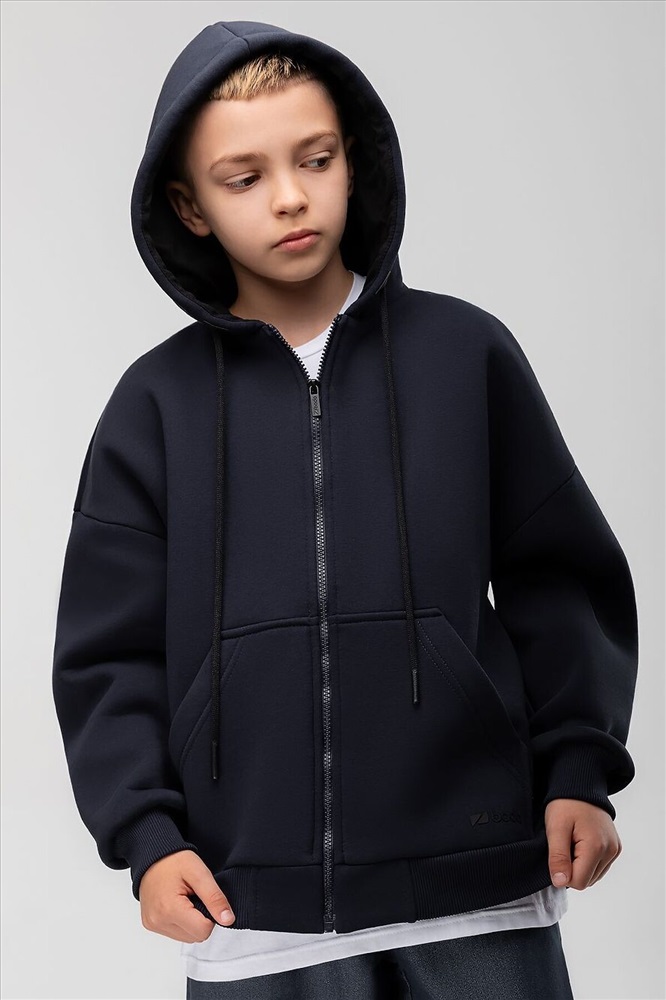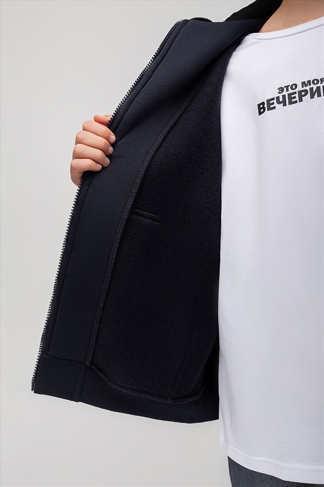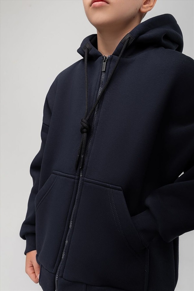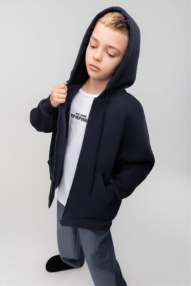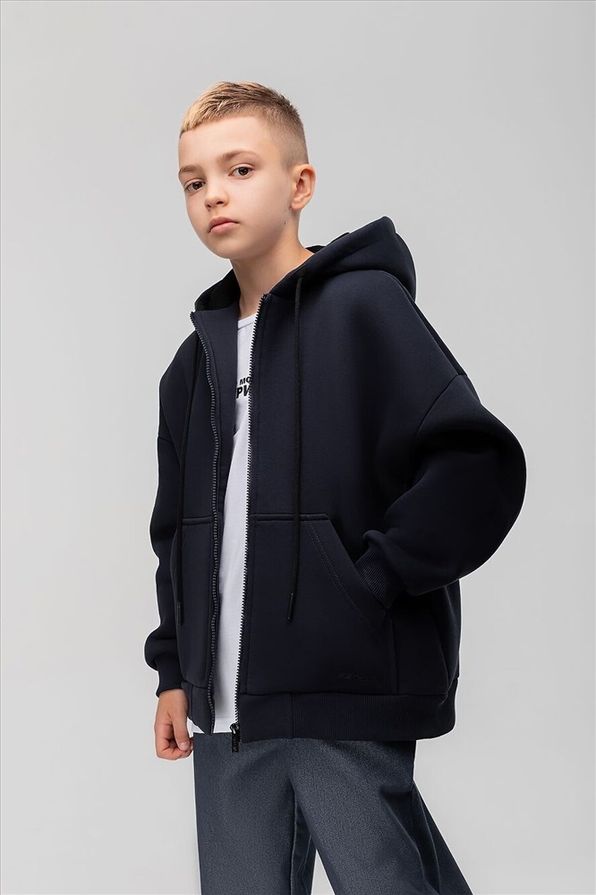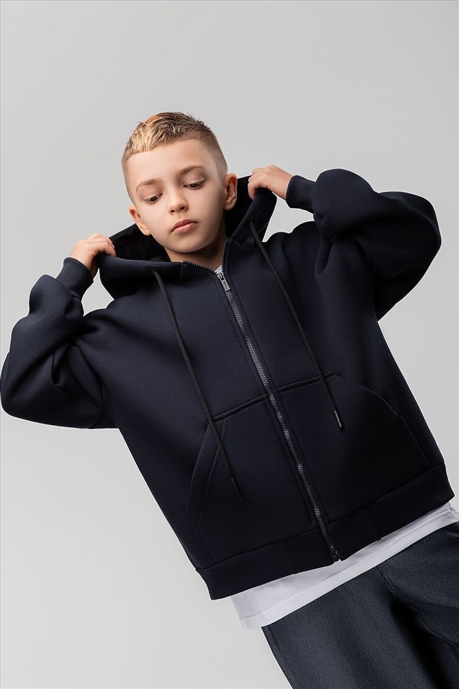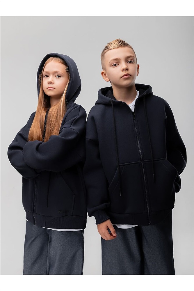 Прямая толстовка на молнии с начесом. Толстовка с капюшоном, со спущенным плечом, рукава с манжетой и пояс по низу. На полочке располагается карман «кенгуру».