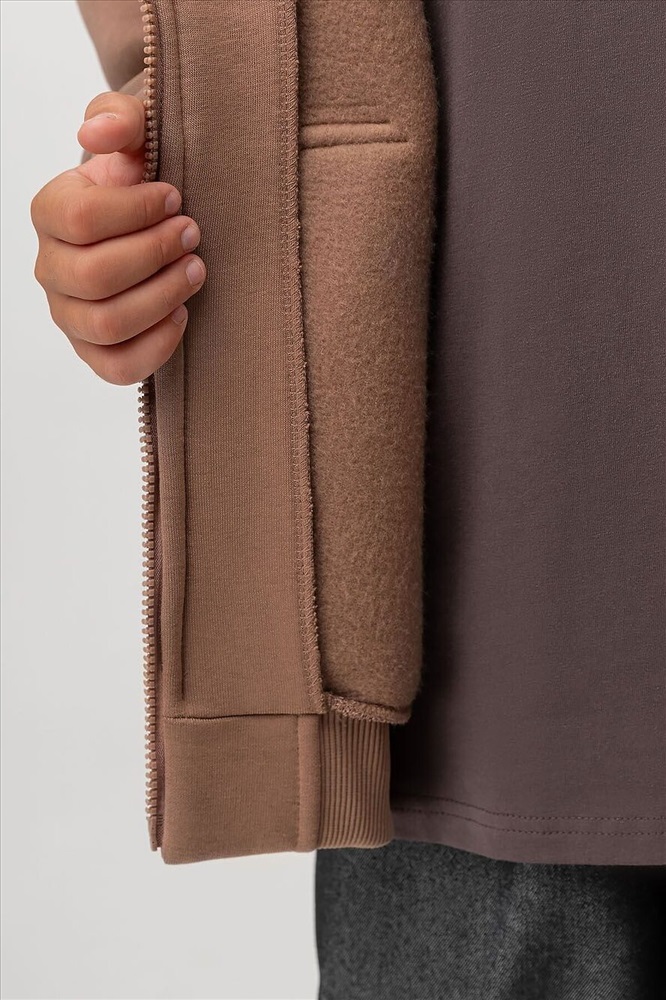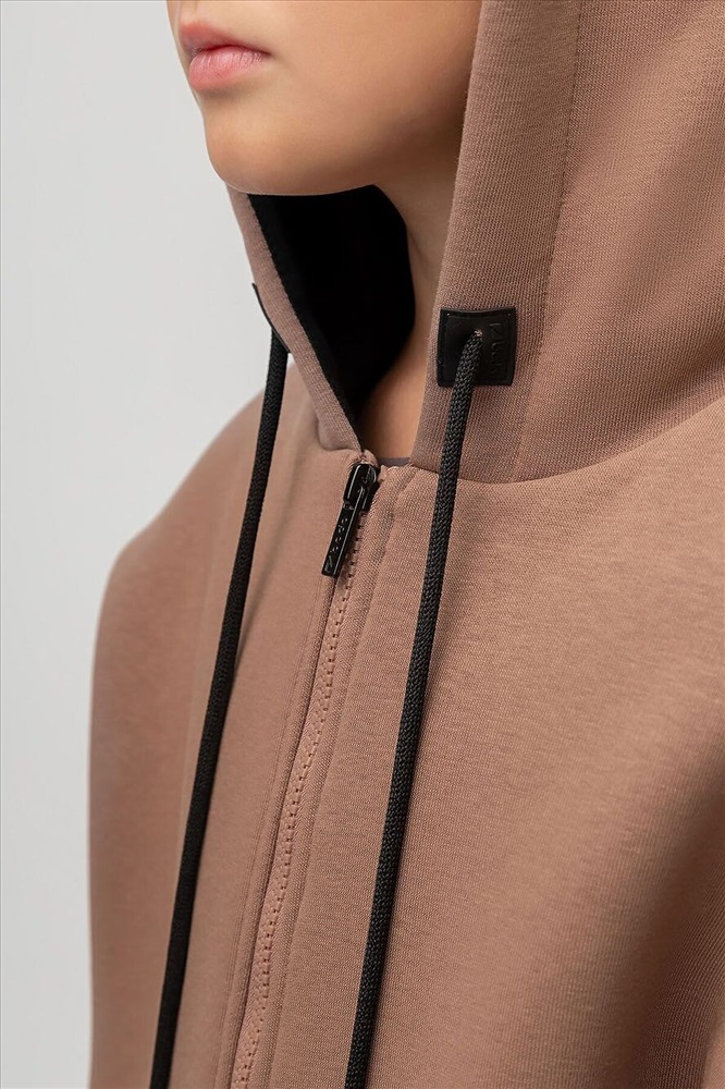 Прямая толстовка на молнии с начесом. Толстовка с капюшоном, со спущенным плечом, рукава с манжетой и пояс по низу. На полочке располагается карман «кенгуру».