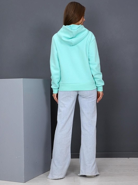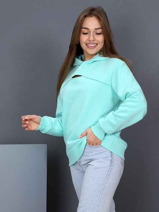 Толстовка выполнена из трикотажного полотна с эффектом велюра. Изделие свободного прилегания, низ и рукава отделаны кашкорсе в тон ткани. Акцент толстовки - это оригинально обработанный вырез в виде глазика.