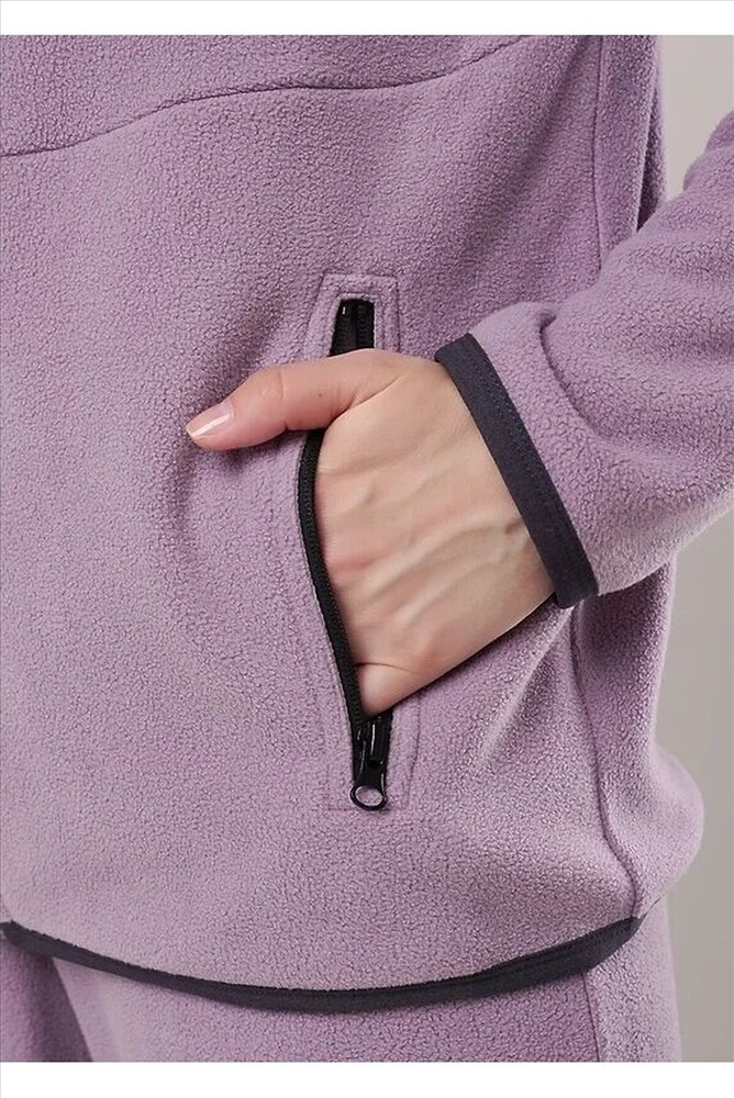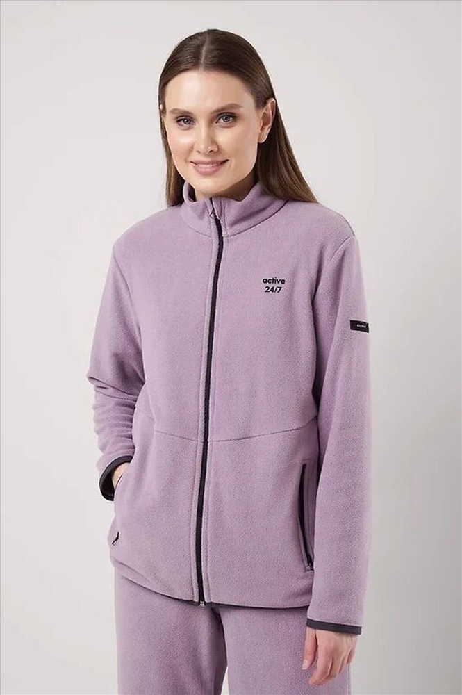 Куртка спортивная прямого силуэта из трикотажного полотна флис, на молнии. По горловине стойка. Спереди горизонтальный рез, карманы на молнии. Длинный рукав со спущенной линией плеча, нашивка.По низу рукава и низа изделия окантовка. Спереди вышивка.