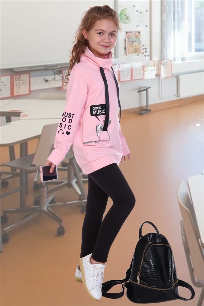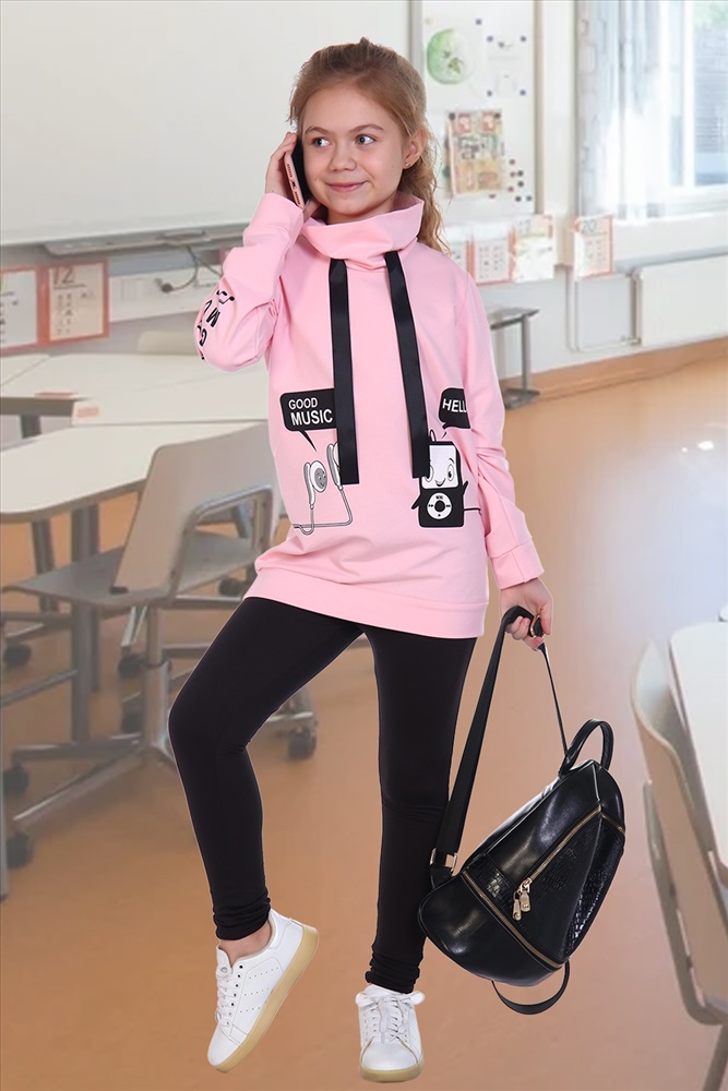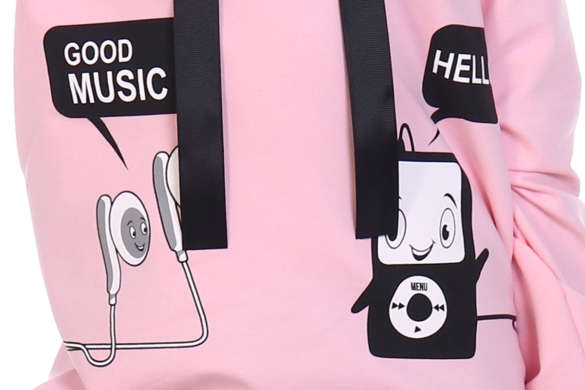 Толстовка удлинённая с воротником-стойкой и шнурком из репсовой ленты, выполнена из трикотажного полотна футера 2-х нитки. В данной модели втачной рукав. На правом рукаве и на полочке присутствует принт. Низ изделия и рукава на манжете из основной ткани. Модель подходит как для прогулки, так и для отдыха. Розовый цвет меланжированный.