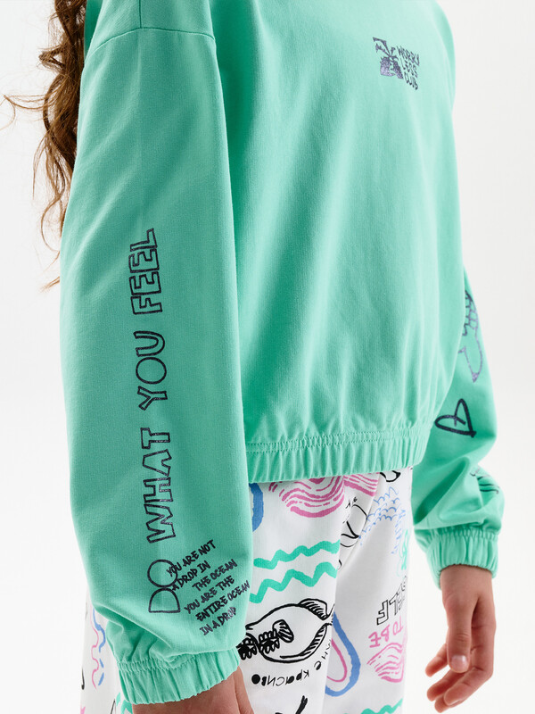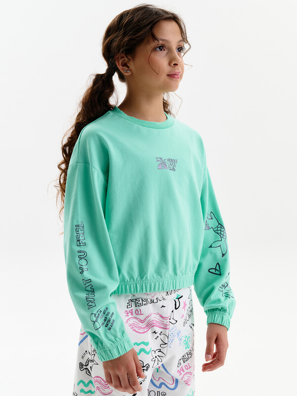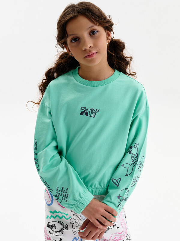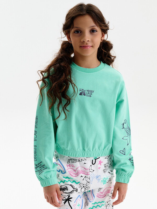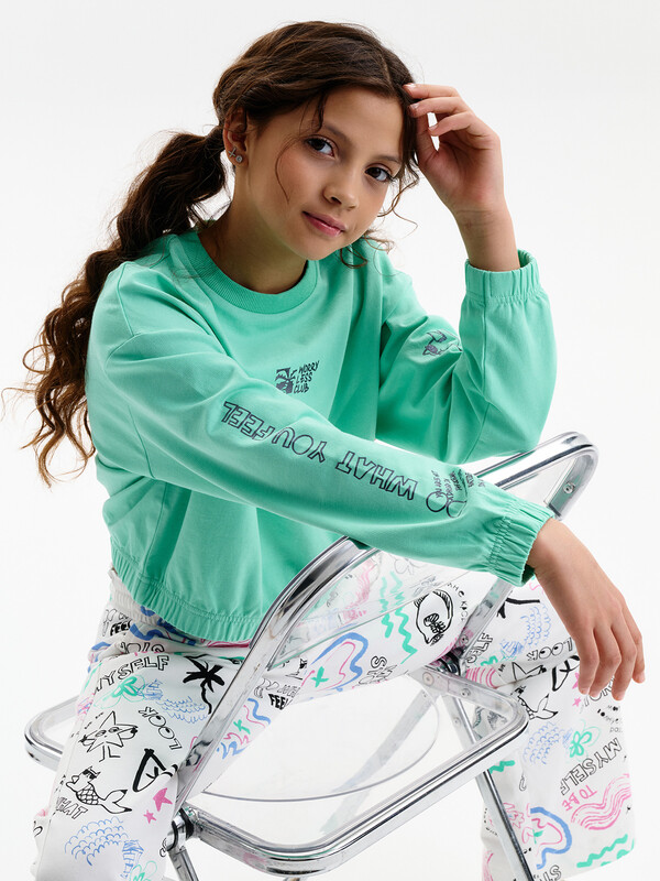 Состав: 100%хлопок Укороченная объемная толстовка из мягкого футера для девочки. Плотность 235 гр/кв.м. 100% хлопок — ткань дышащая, приятная на ощупь и очень комфортная. Низ изделия и рукавов собраны на широкую внутреннюю резинку — модель красиво и аккуратно сидит по фигуре, рукава не сползают. Весь декор с блестками. Перевод на рукавах: Делай то, что чувствуешь. Ты не капля в океане. Ты — весь океан в капле. Перевод спереди: клуб «Беспокойтесь меньше». Комментарии к товару