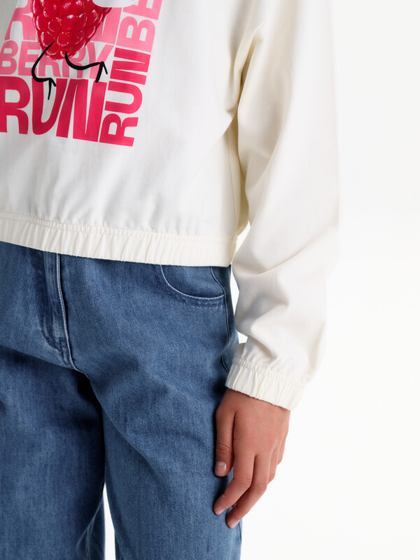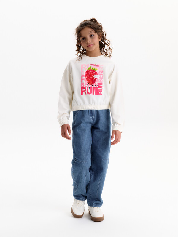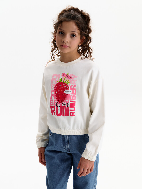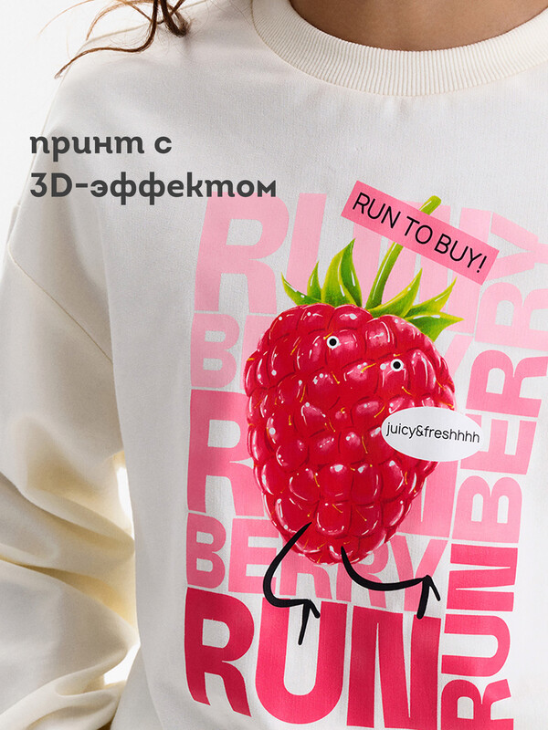 Укороченная объемная толстовка из мягкого футера для девочки. Плотность 235 гр/кв.м. 100% хлопок — ткань дышащая, приятная на ощупь и очень комфортная. Низ изделия и рукавов собраны на широкую внутреннюю резинку — модель красиво и аккуратно сидит по фигуре, рукава не сползают. Перевод: двигается реально быстро!! БЕГИ БЕГИ ЯГОДА; сочная и свежая.