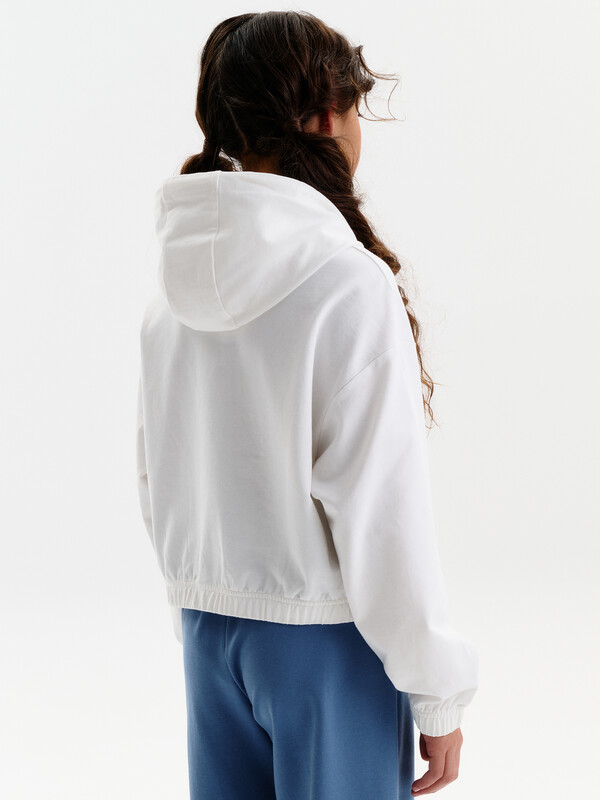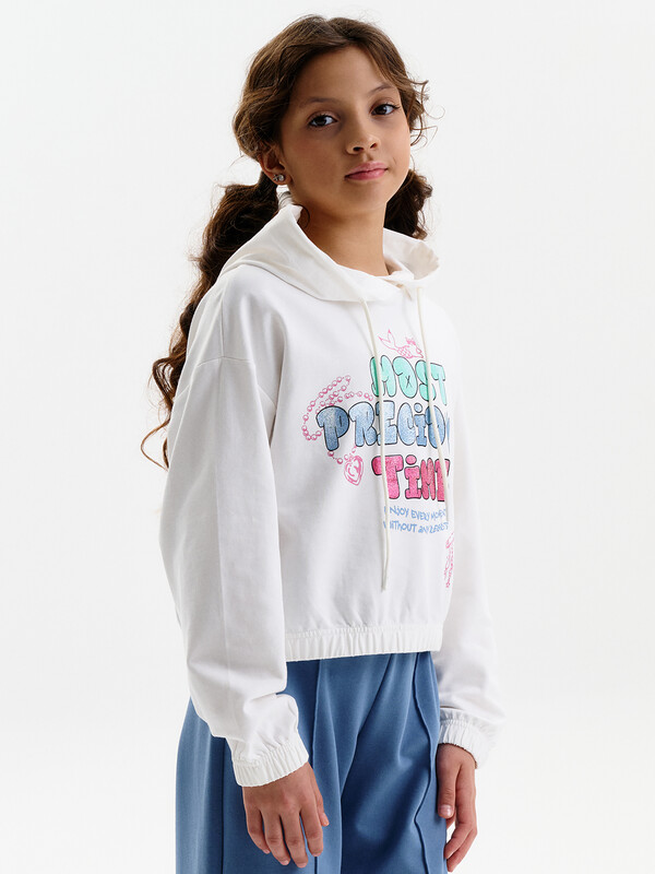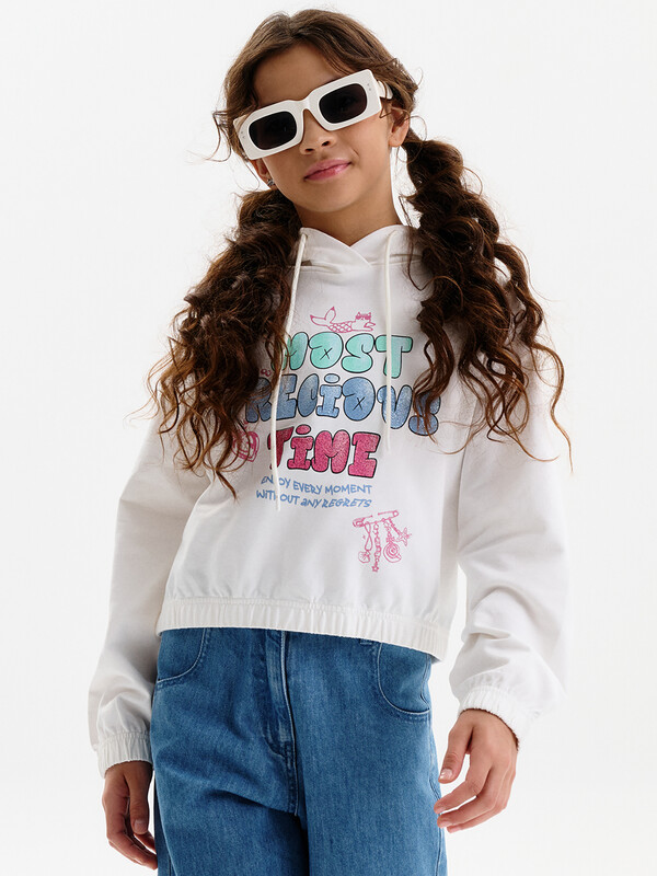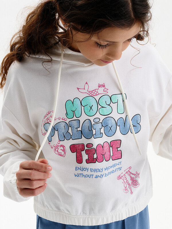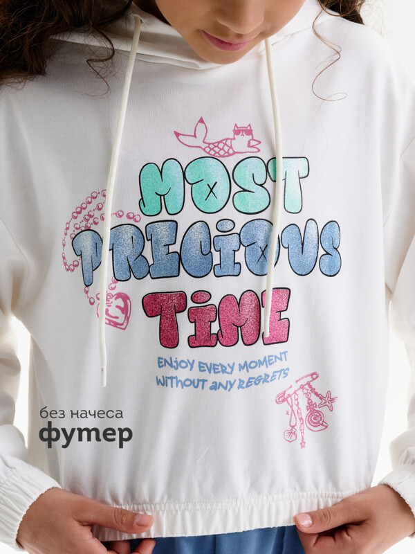 Худи из футера среднего объема укороченное. Плотность 235 гр/кв.м. Выполнена из 100% хлопка. Капюшон с утяжкой на шнурке позволяет регулировать степень защиты от ветра и холода. По низу изделия и рукавов проходит туннельная резинка, обеспечивающая комфортную посадку.В принте разноцветный глиттер. Перевод: самое драгоценное время; наслаждайся каждым моментом без сожалений