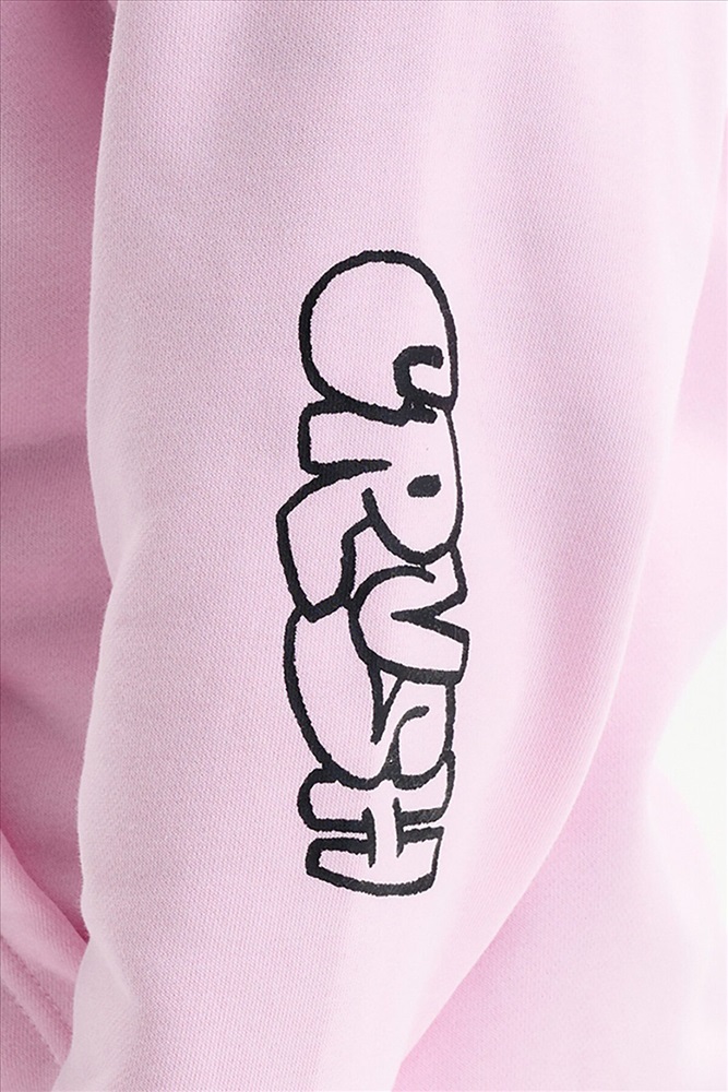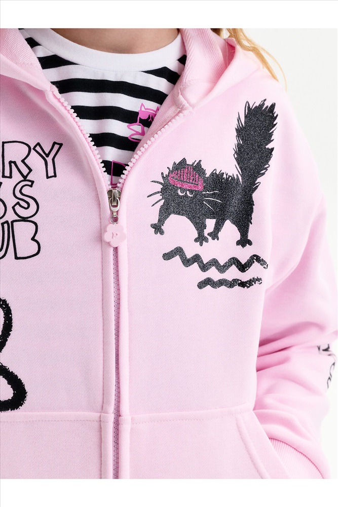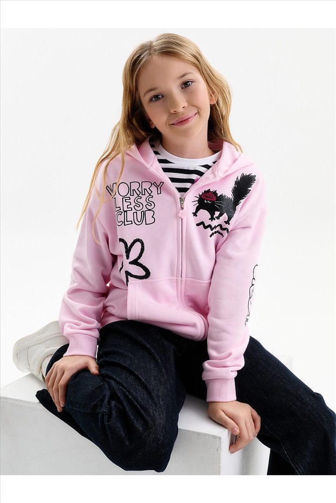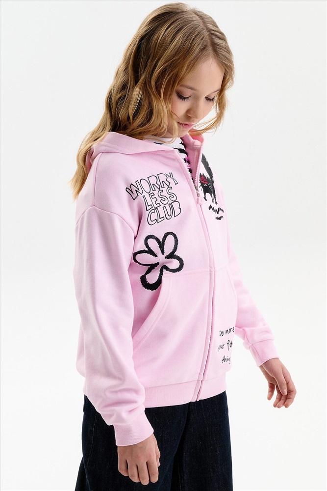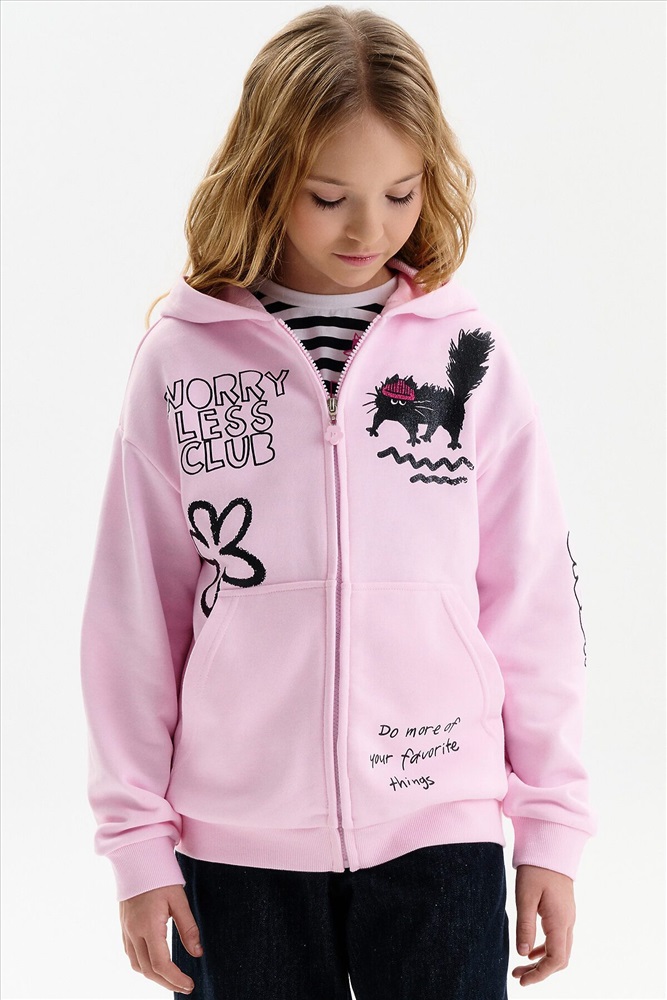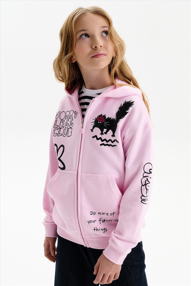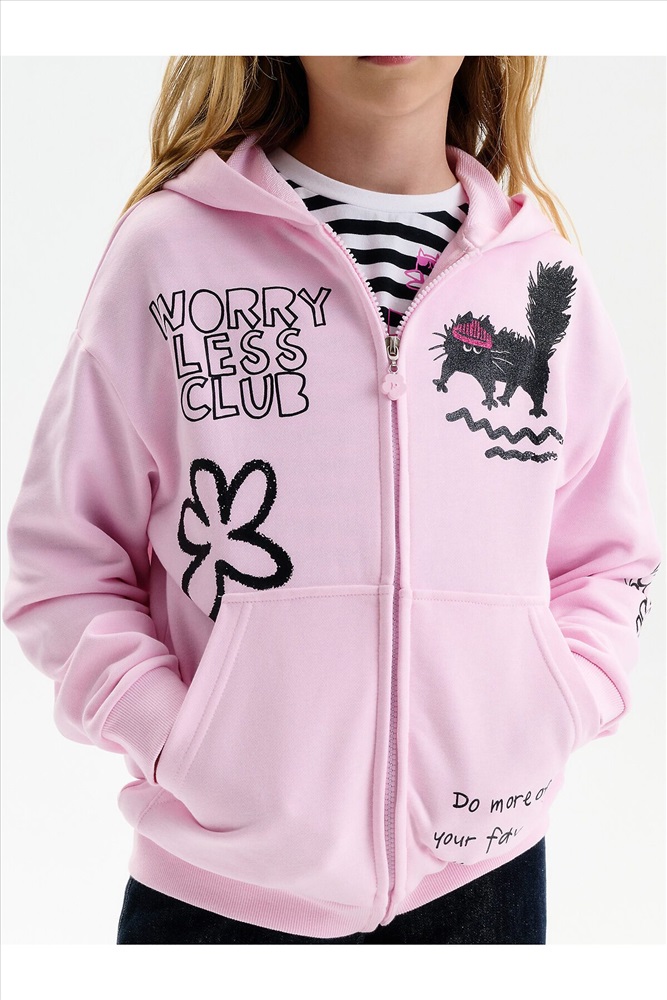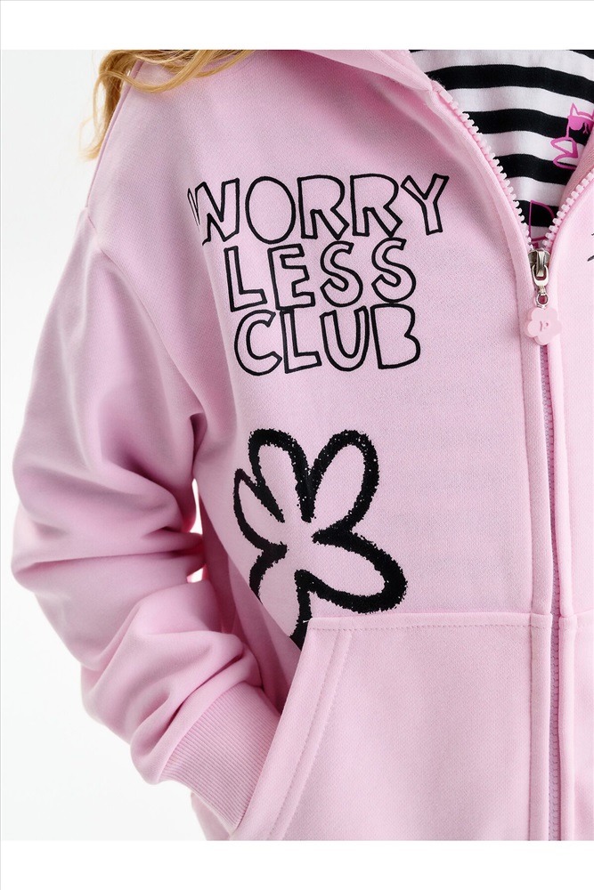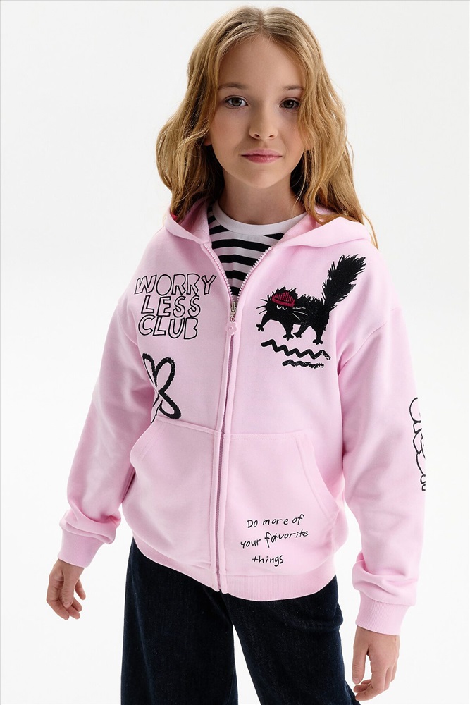 Толстовка для девочки. Повтор модели сезона Autumn’25, обновлённый — слегка уменьшили объём, чтобы посадка стала более аккуратной и универсальной. Толстовка выполнена из мягкого смесового футера. Длина — стандартная, силуэт свободный, со спущенным плечом. Центральная молния спрятана под напуском из основной ткани, сохраняет чистый и аккуратный внешний вид. По низу изделия и рукавов — плотная рибана, которая фиксирует посадку. Спереди расположены накладные карманы-кенгуру. Капюшон двойной, с регулировкой объема шнуром — удобно и функционально. Декоративный пуллер в виде цветочка с буквой P. В принте блестки. Перевод спереди: клуб «Беспокойтесь меньше»: делайте больше своих любимых дел. На рукве: Краш.