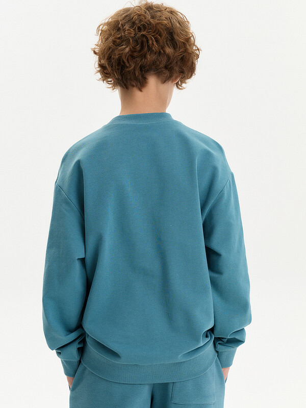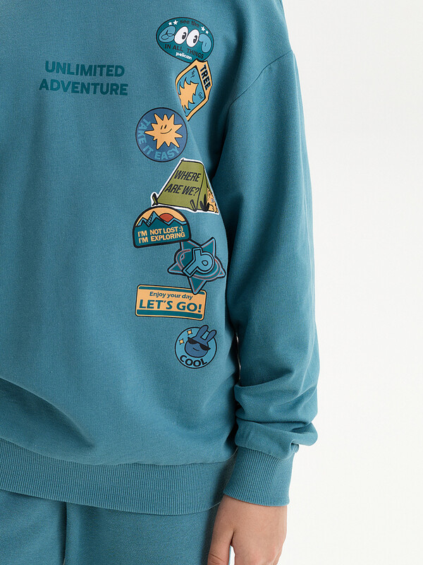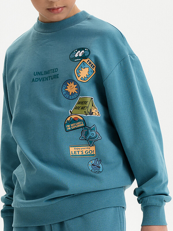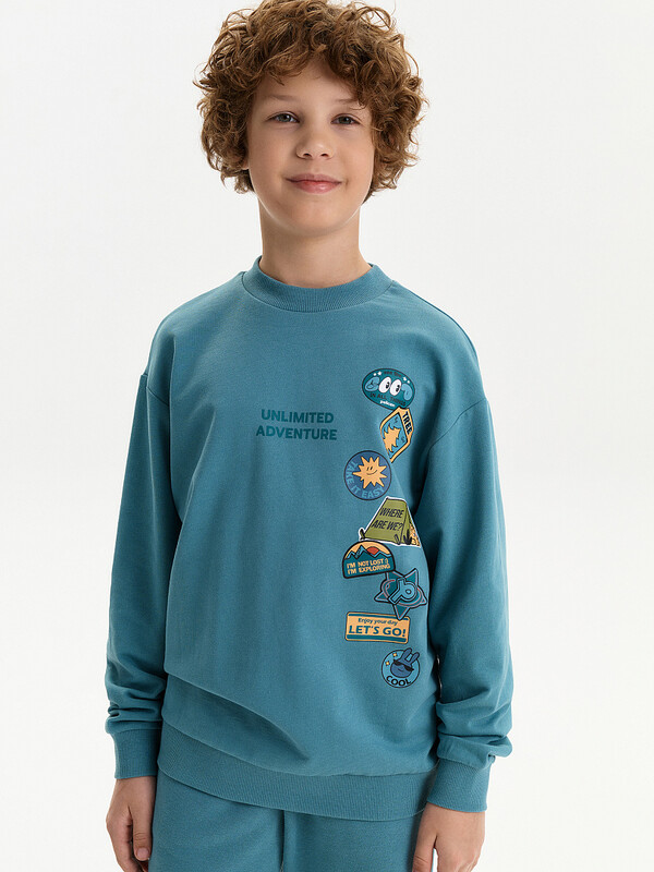 Свитшот из материала футер-петля. Манжеты и низ изделия из рибаны. Перевод текста: Безграничные приключения; Видеть во всём хорошее; Не напрягаться; Где мы?; Я не потерялся, я исследую; Наслаждайтесь своим днём; Вперёд!