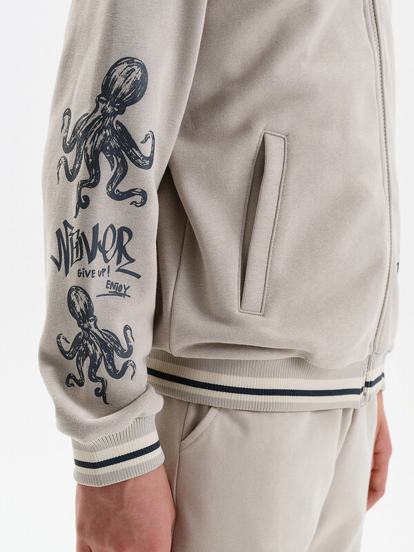 Состав: 84%хлопок 16%полиэстер Бомбер для мальчика – трикотажная модель свободного кроя. Изделие выполнено из смесовой ткани с высоким содержанием хлопка и небольшим добавлением полиэстера.Бомбер на центральной застежке молнии, со спущенным плечом и углубленной проймой. Воротник, манжеты по рукавам и низу изделия - из декоративного полосатого риба. Боковые карманы с листочками расположены на переде под наклоном. Бомбер декорирован принтом и надписями. Перевод текста на рукавах: никогда не сдавайся; наслаждайся. Перевод на кармане: Ты можешь совершать великие дела. Живи настоящим. Всё, что у нас есть, — это настоящее. Комментарии к товару