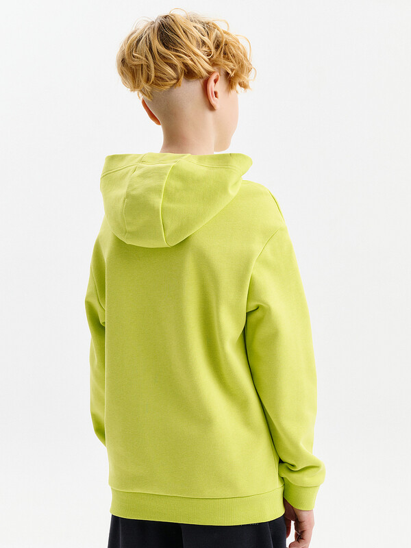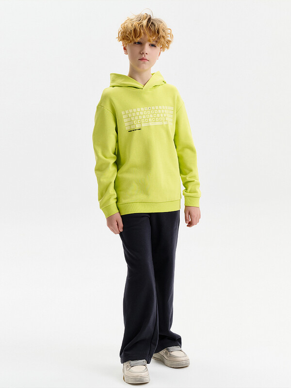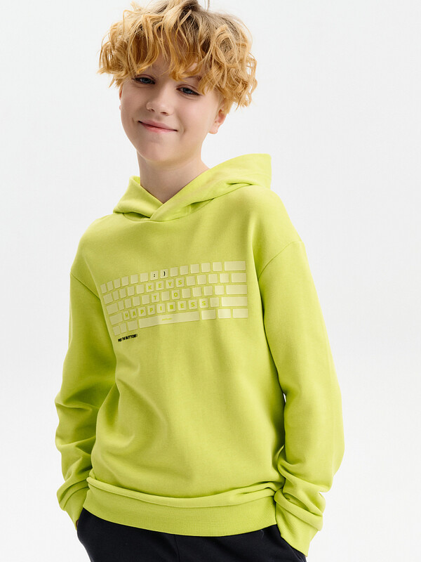 Худи для мальчика. Ткань футер-петля без начёса. Толстовка свободного покроя со спущенным плечом, углубленной проймой. Рукава, а также низ изделия на манжете из рибаны. Кофта без карманов. Капюшон объемный, без регулировки, отлично держит форму. Перевод текстов: клавиши к счастью; жми на кнопки.