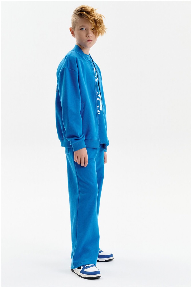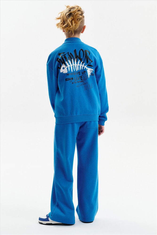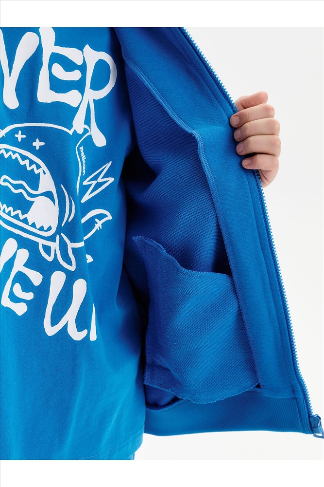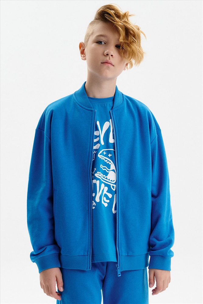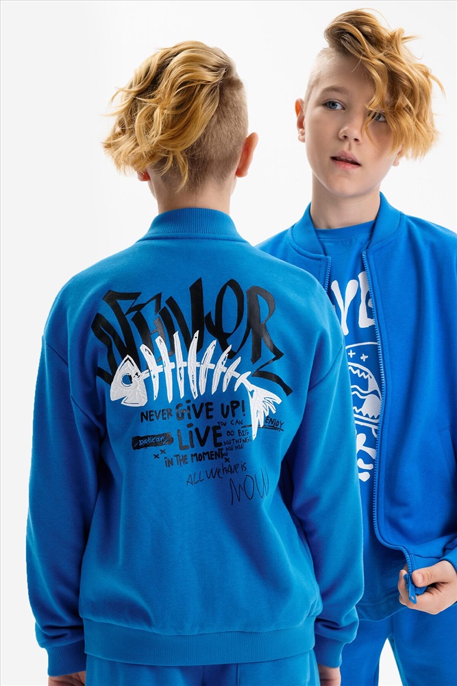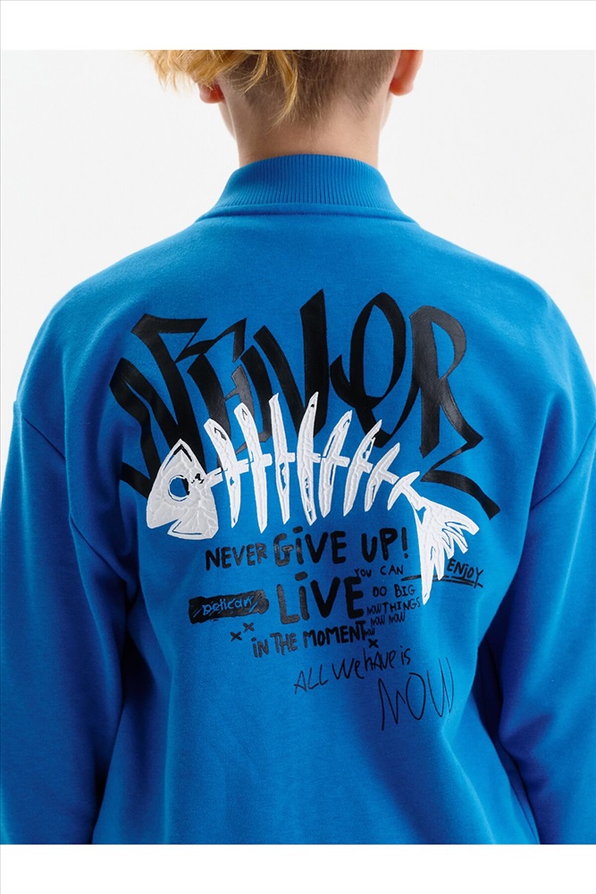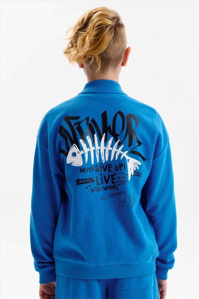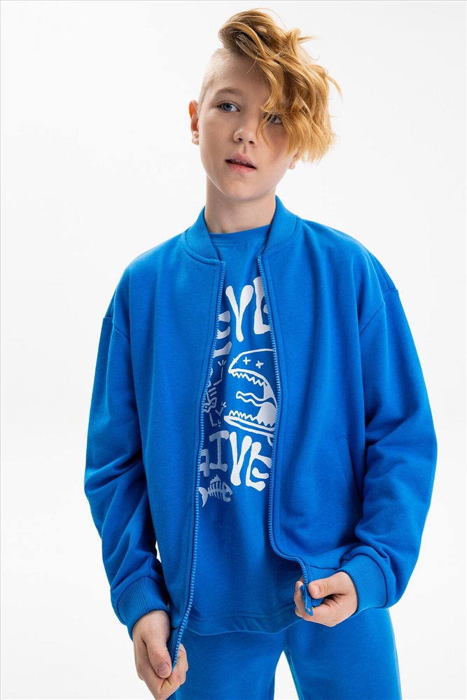 Бомбер для мальчика – трикотажная модель свободного кроя. Изделие выполнено из смесовой ткани с высоким содержанием хлопка и небольшим добавлением полиэстера.Бомбер на центральной застежке молнии, со спущенным плечом и углубленной проймой. Воротник, манжеты по рукавам и низу изделия - из рибаны. Боковые карманы с листочками расположены на переде под наклоном. Бомбер декорирован принтом и надписями. Перевод принта: никогда никогда не сдавайся: наслаждайся: Ты можешь совершать великие дела. Живи настоящим. Всё, что у нас есть, — это настоящее.