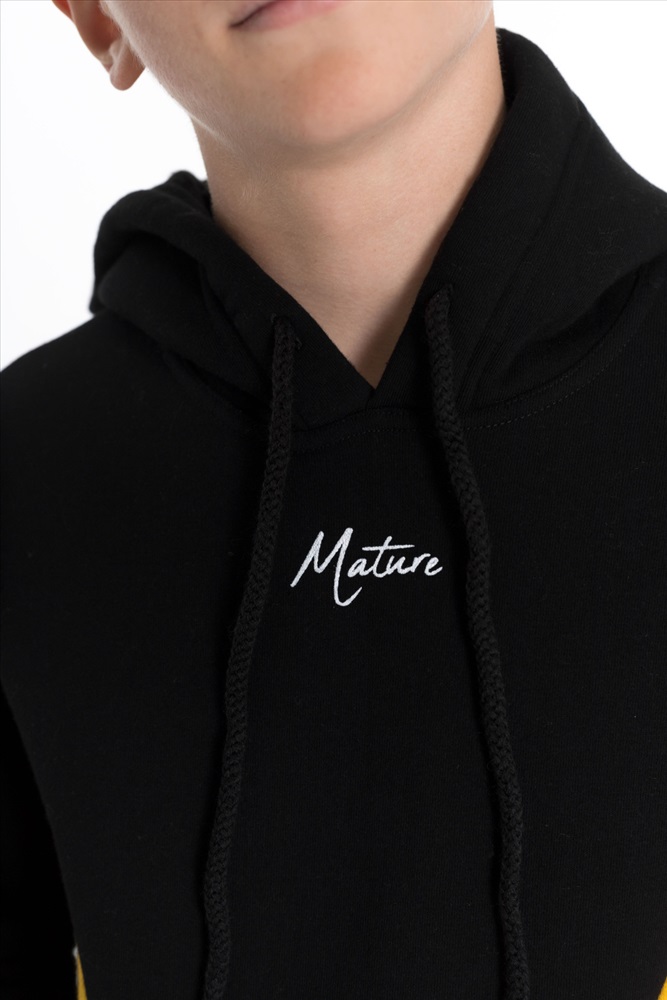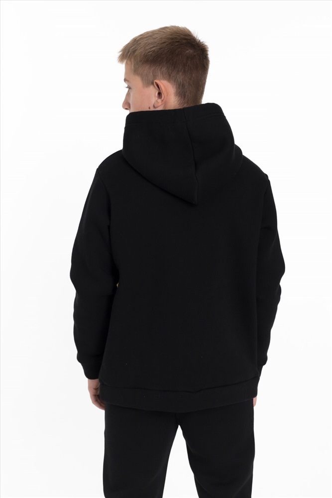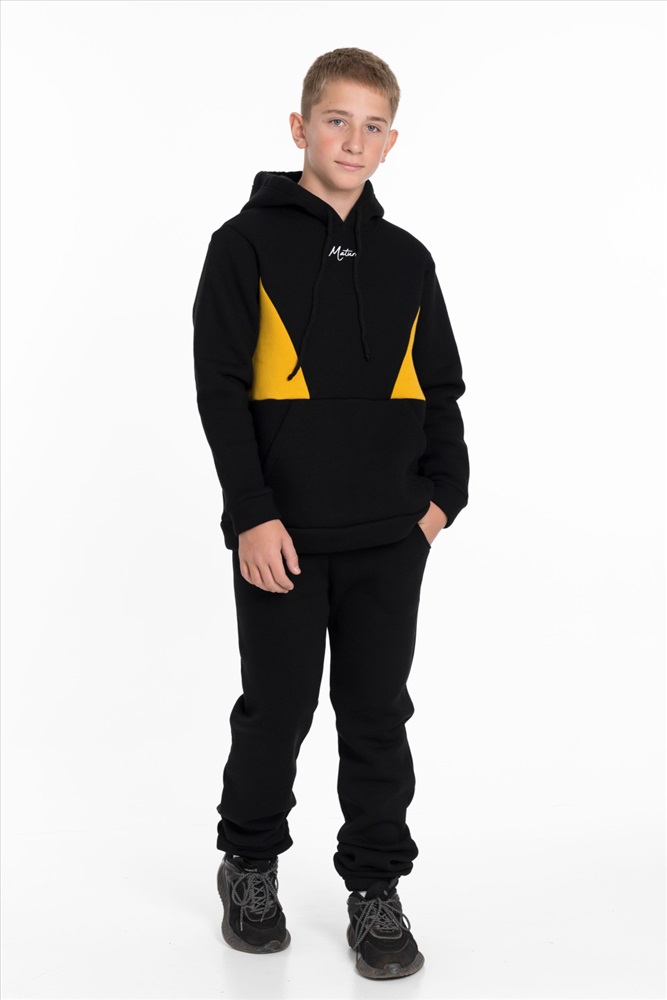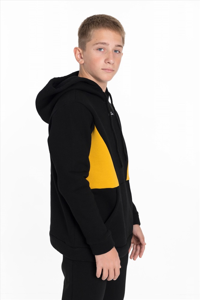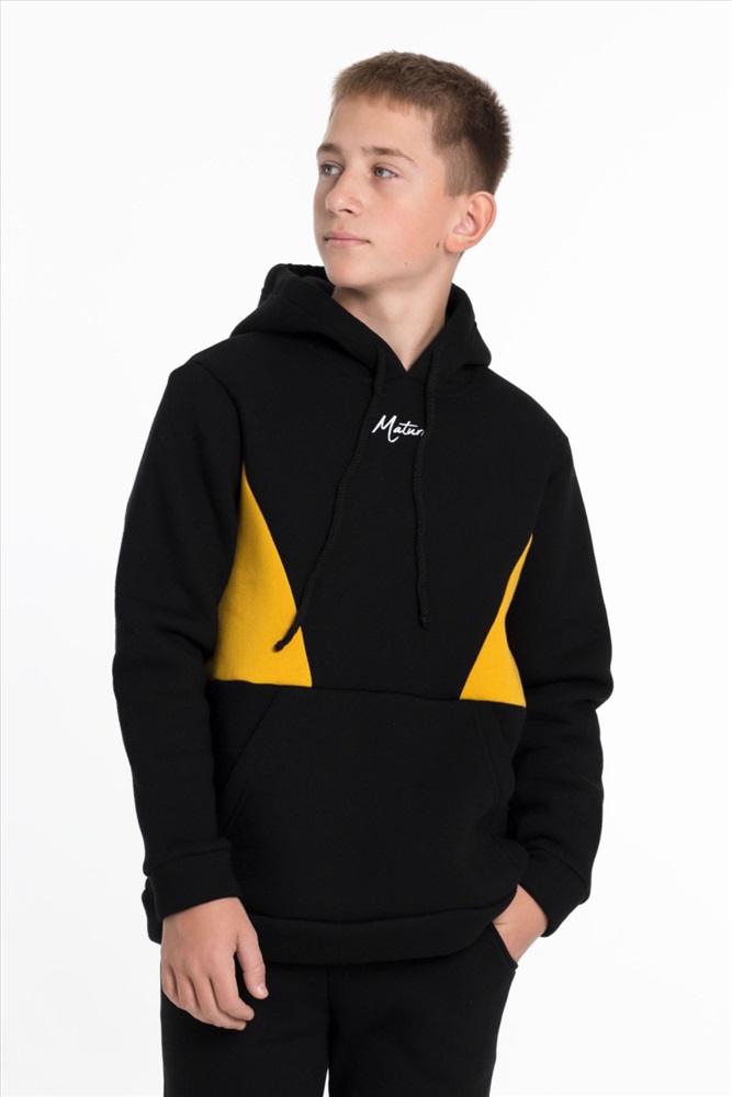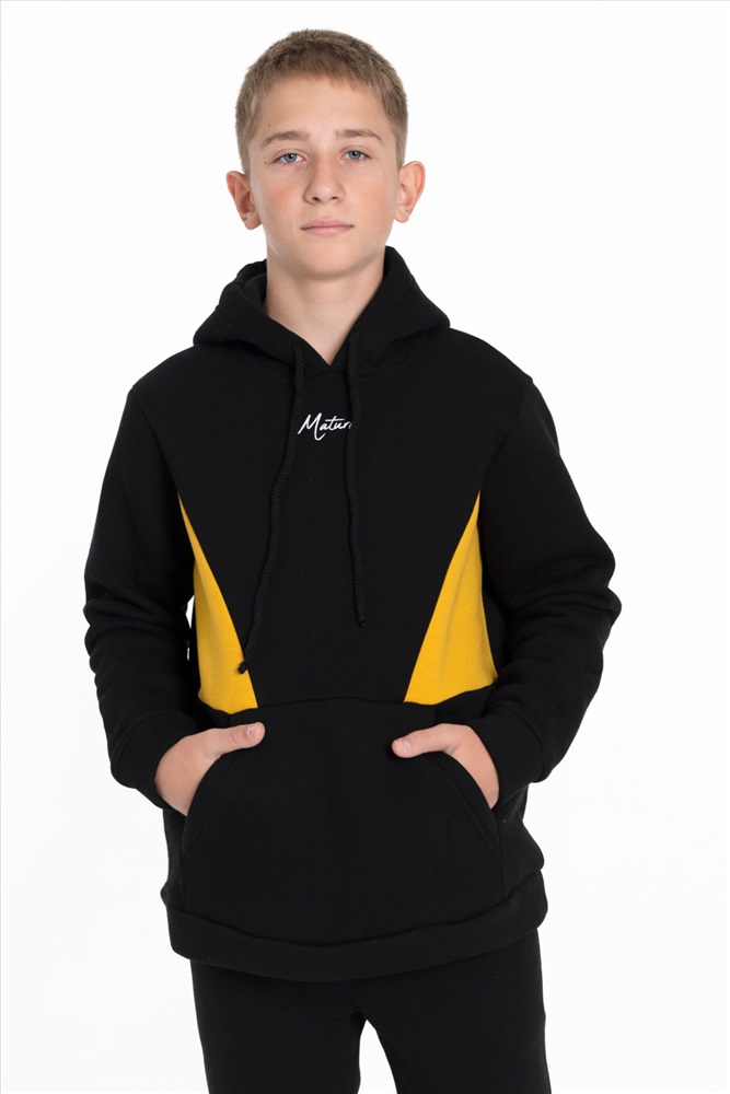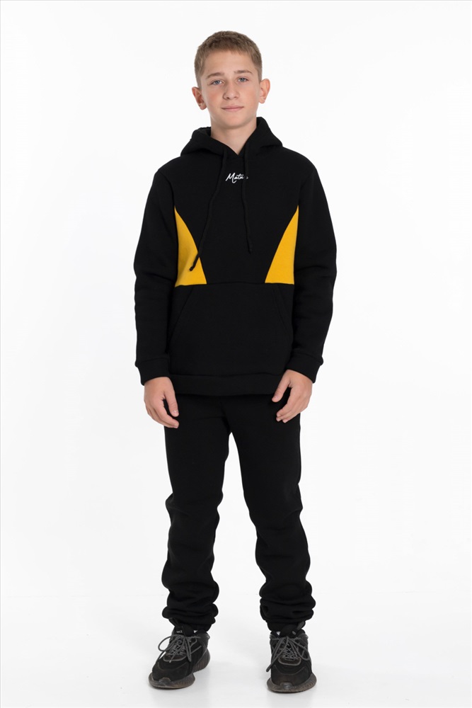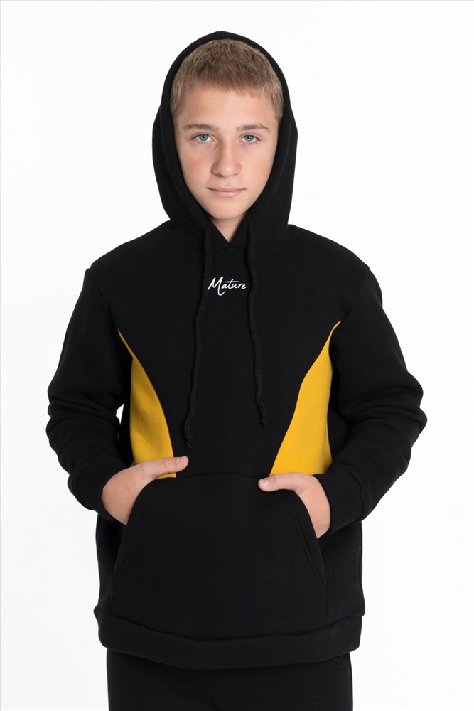 С капюшоном: Да С карманами: Да Сезон: Зимний Силуэт: Свободный Состав: Хлопок 70% Полиэстер 30% Цвет Номенклатуры: черный Толстовка для мальчика из черного футера 3-х нитки с начесом и отделкой горчичного цвета представляет собой стильную и удобную одежду. Прямого кроя, с длинным рукавом, капюшоном на шнуре и карманом-кенгуру, она идеально подходит для повседневного использования. Принт на полочке добавляет интересный акцент и делает толстовку более выразительной. Эта модель будет отличным выбором для активных и модных мальчишек. Размерный ряд: 30/110 - 42/164 Комментарии к товару