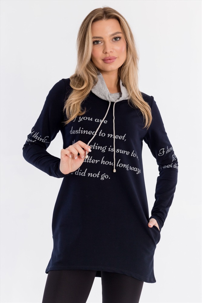 С капюшоном: Нет С карманами: Нет Сезон: Всесезонный Силуэт: Свободный Состав: Хлопок 95% Лайкра 5% Цвет Номенклатуры: синий Толстовка из футер петли с лайкрой. Модель свободного силуэта, с длинными рукавами. Воротник выполнен из кулирного полотна с лайкрой контрастного цвета, внутри вставлен шнур. Спереди и на рукавах нанесён принт. В боковых швах расположены карманы. . Комментарии к товару