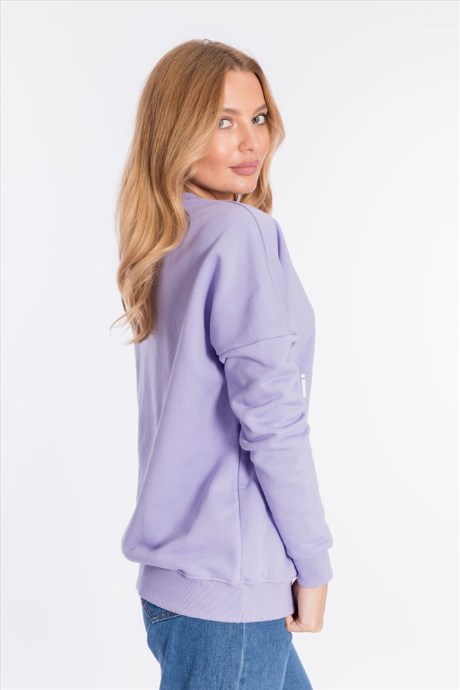 Толстовка свободного силуэта выполнена из футер петли (трёхнитка воздушка). Линия плеча спущена, спереди нанесён принт. Пояс и рукава с манжетами из кашкорсе.