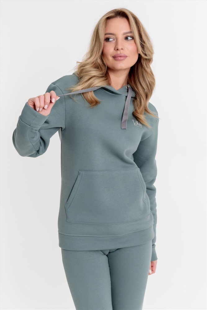 Толстовка выполнена из полотна c начёсом (футер трёхнитка). Капюшон со шнуром. Спереди расположена вышивка и карман-кенгуру.