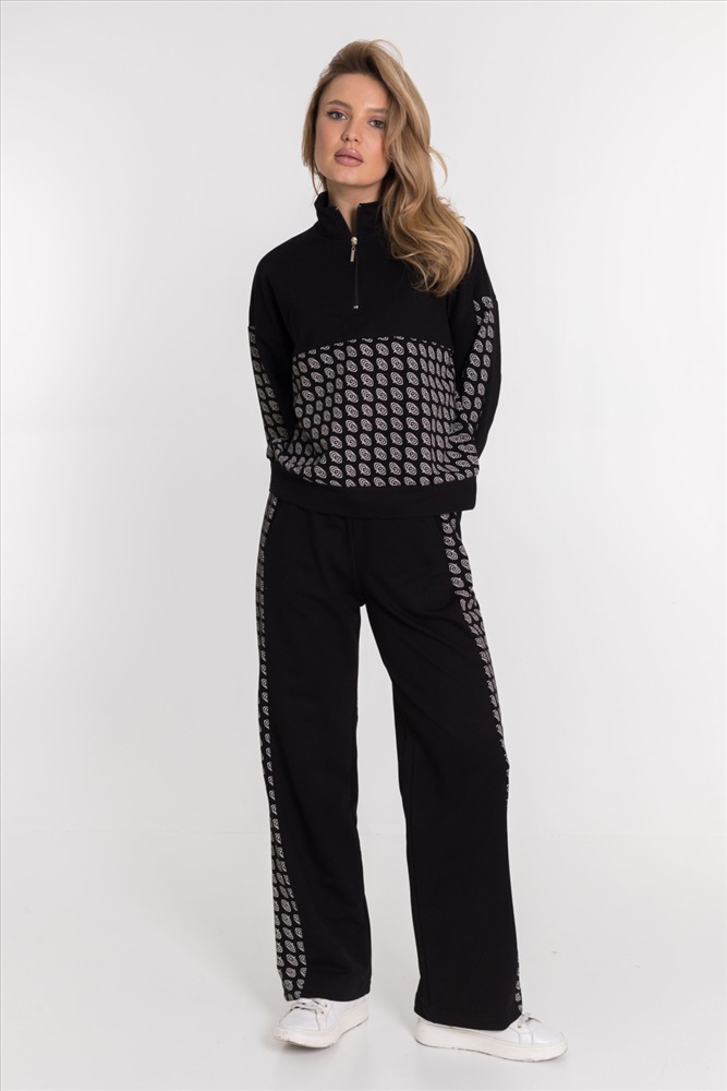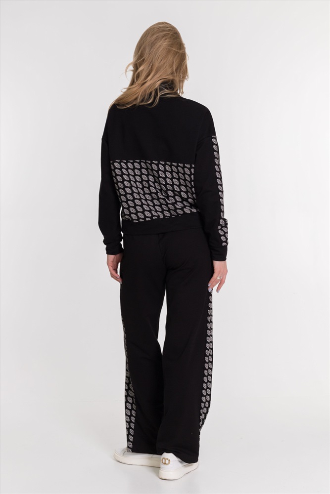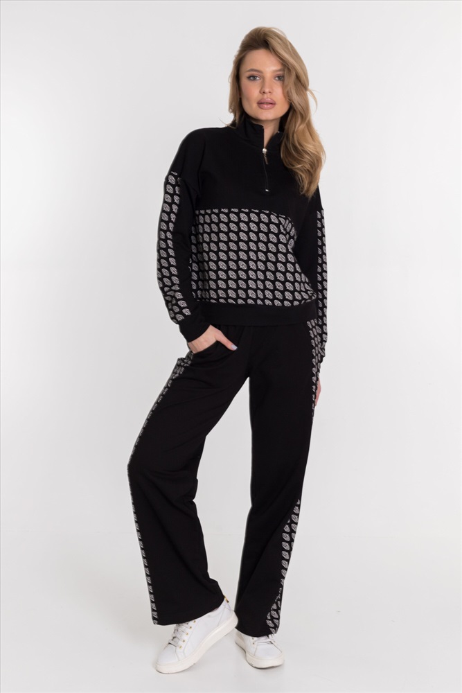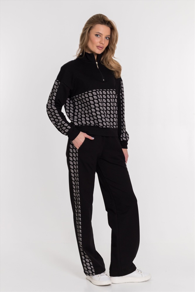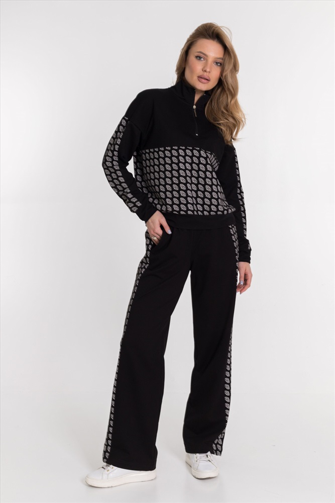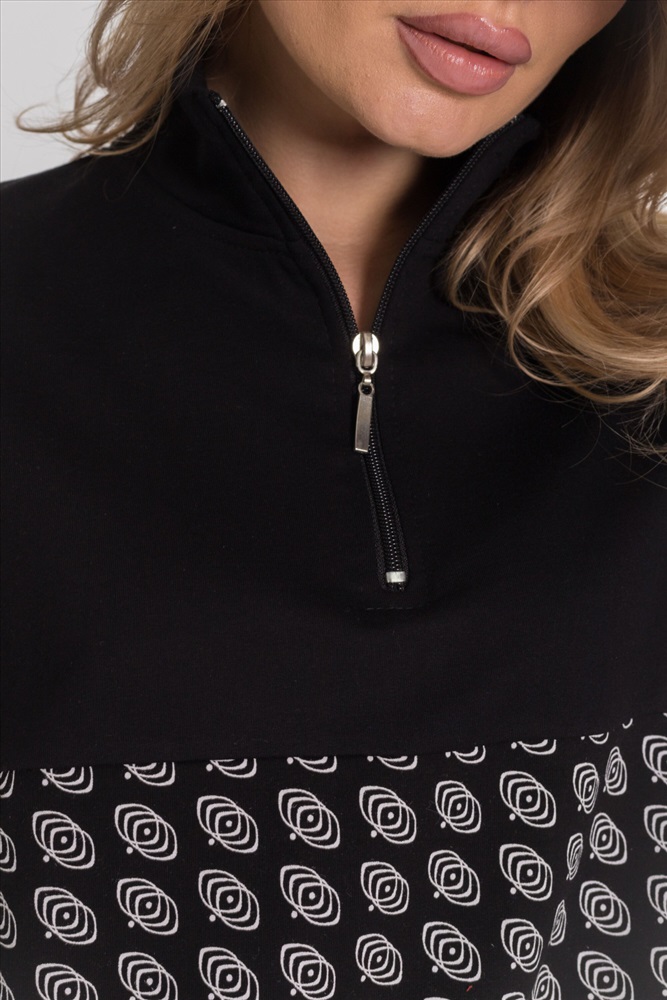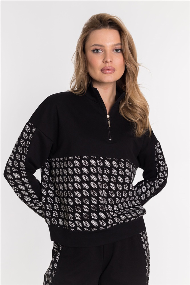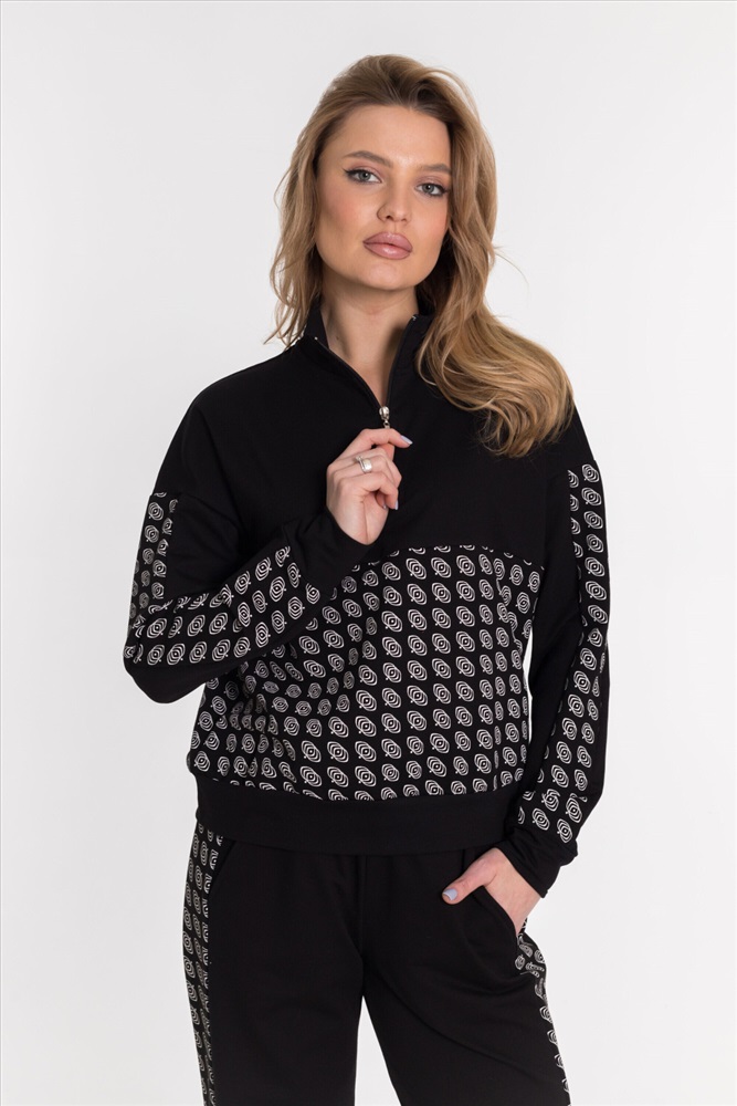 Женская толстовка из футера с лайкрой черного цвета. Спущенная линия плеча и рукав с отделочной полосой делают толстовку стильной и модной. Футер с лайкрой обеспечивает хорошую посадку и удобство в ношении. Полочка и спинка с кокетками придают изделию оригинальность. Воротник-стойка с застежкой на молнию, не доходящую до линии кокетки, обеспечивает комфорт и защиту от ветра. Низ на манжете добавляет элегантности и завершенности внешнему виду толстовки.