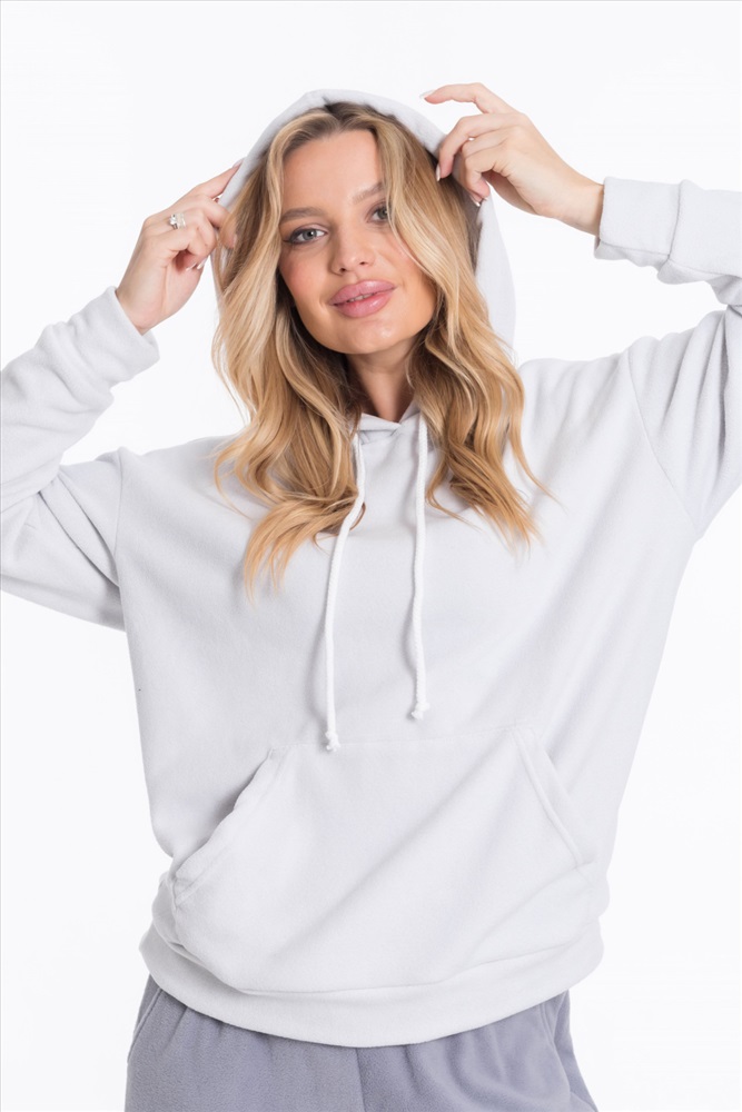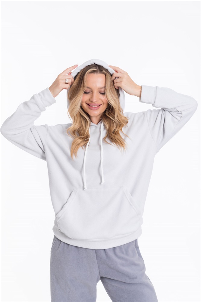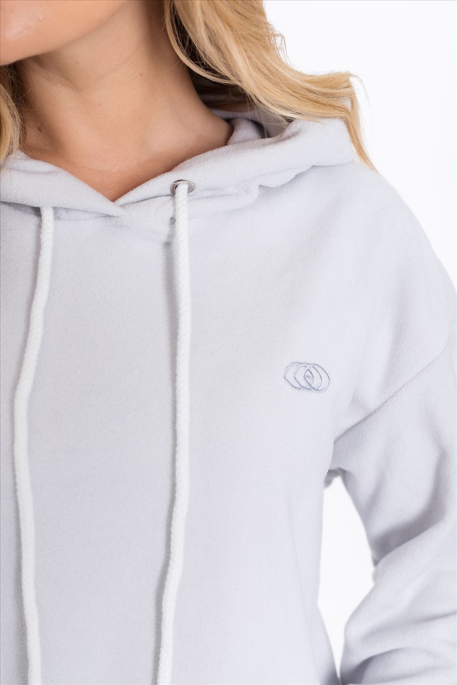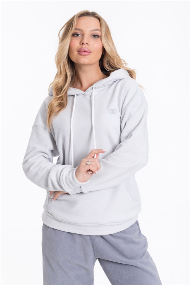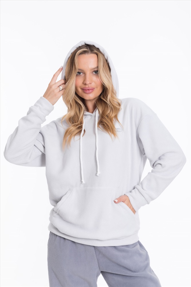 Серая женская толстовка из флиса — отличный выбор для повседневной носки. Линия плеча спущена, есть удобный карман-кенгуру. Вышивка спереди придаёт изделию оригинальность. Капюшон со шнуром можно регулировать по размеру.