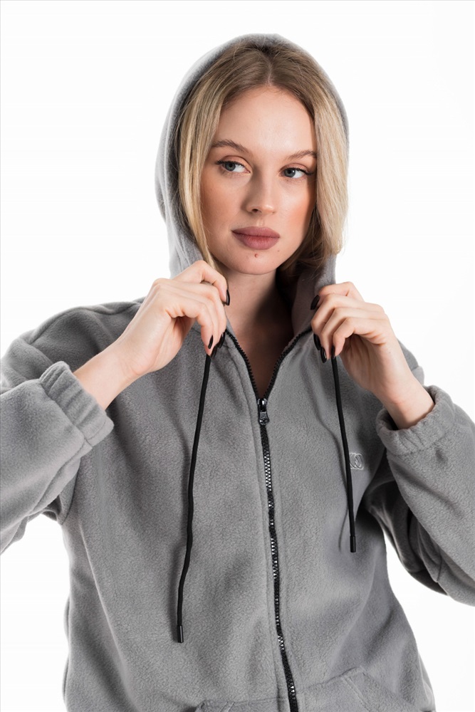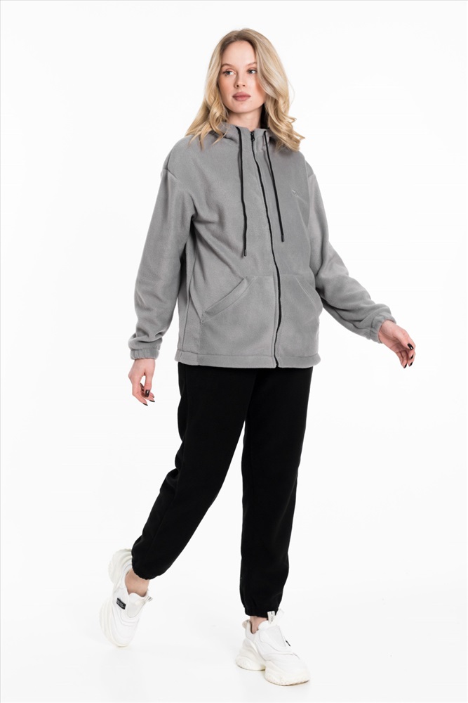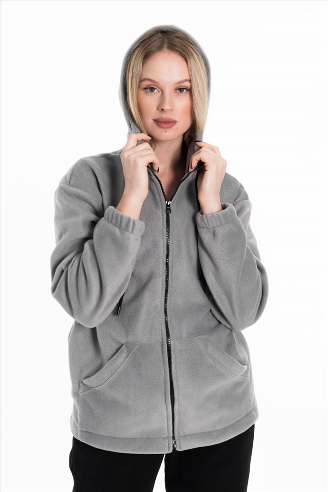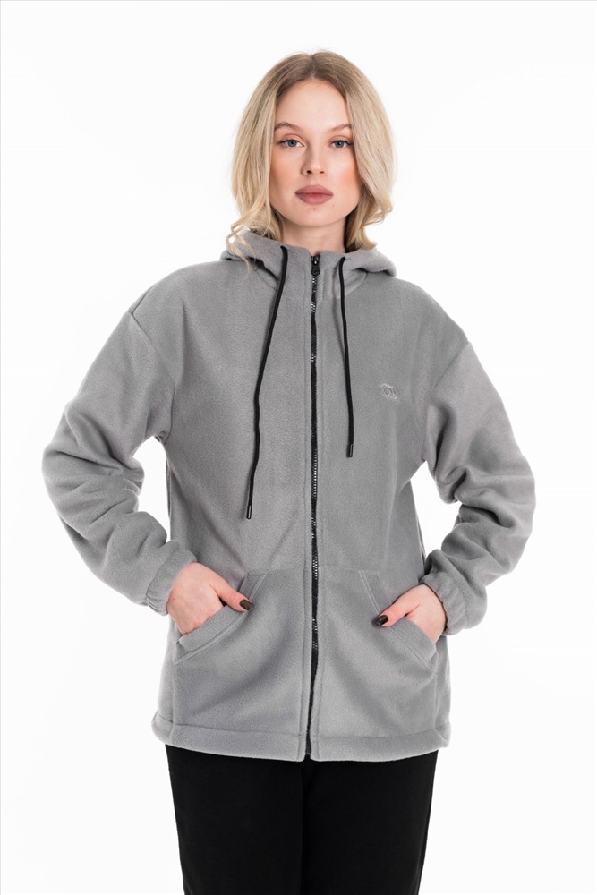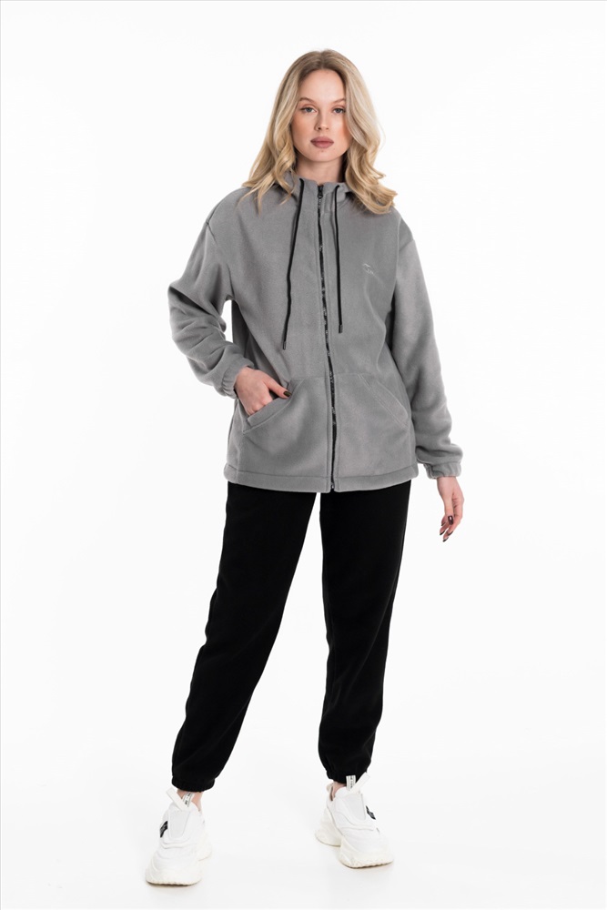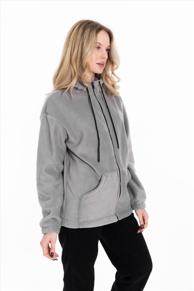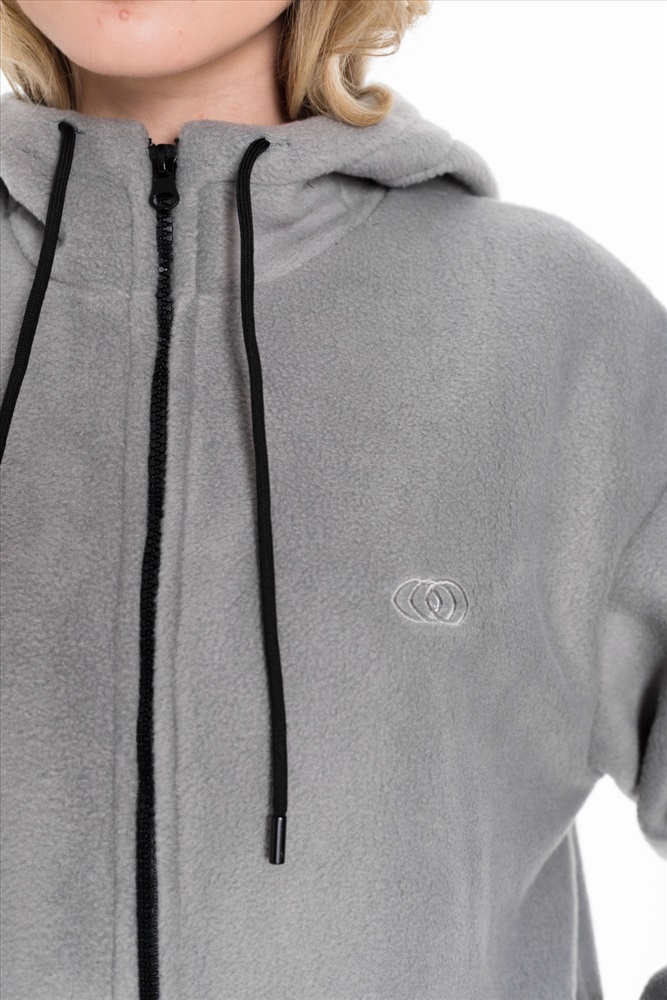 Женская толстовка свободного кроя — отличный выбор для повседневной носки. Она изготовлена из мягкого и тёплого однотонного темно-серого флиса, который обеспечивает комфорт в прохладную погоду. Толстовка имеет воротник-стойку, удобный капюшон и рукава на манжете с резинкой для защиты от ветра. Центральная застёжка на молнию и шнур в капюшоне выполнены в черном цвете, что придает изделию оригинальность. В накладные карманы удобно поместить необходимые мелочи. На передней части толстовки расположена вышивка. Эта толстовка идеально подойдёт для прогулок, активного отдыха или домашней носки. Она выполнена из качественного материала, который сохраняет форму и цвет после стирки, не скатывается.