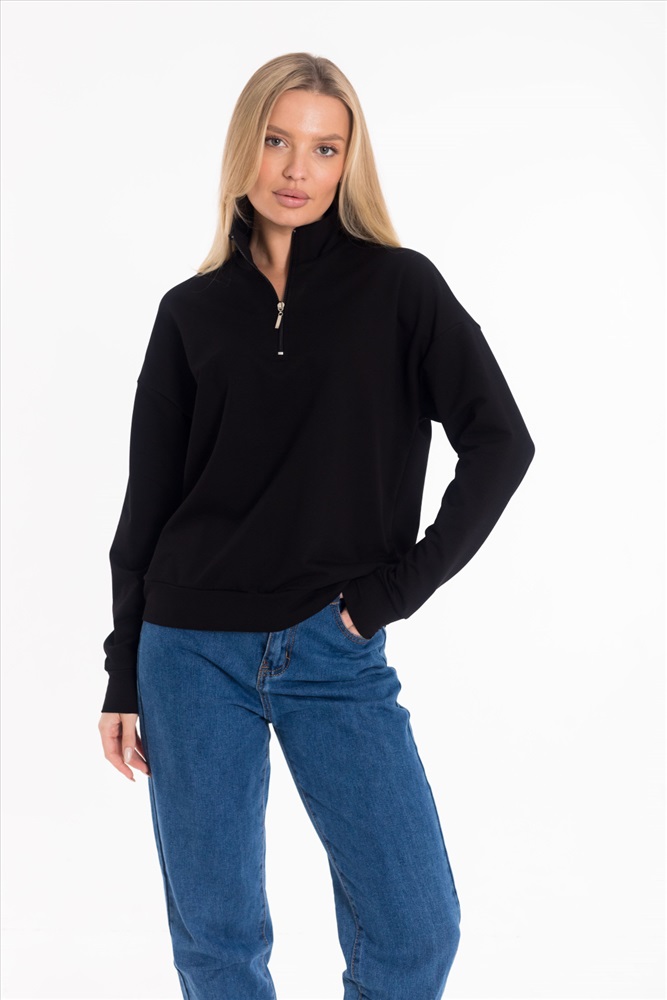 Стильная толстовка выполнена из футера двухнитки. Модель с удобной короткой застежкой на молнию и практичным воротником-стойкой, обеспечивающим дополнительное тепло и комфорт. Рукава дополнены манжетами из основного полотна. Низ изделия оформлен притачным поясом для аккуратной посадки.