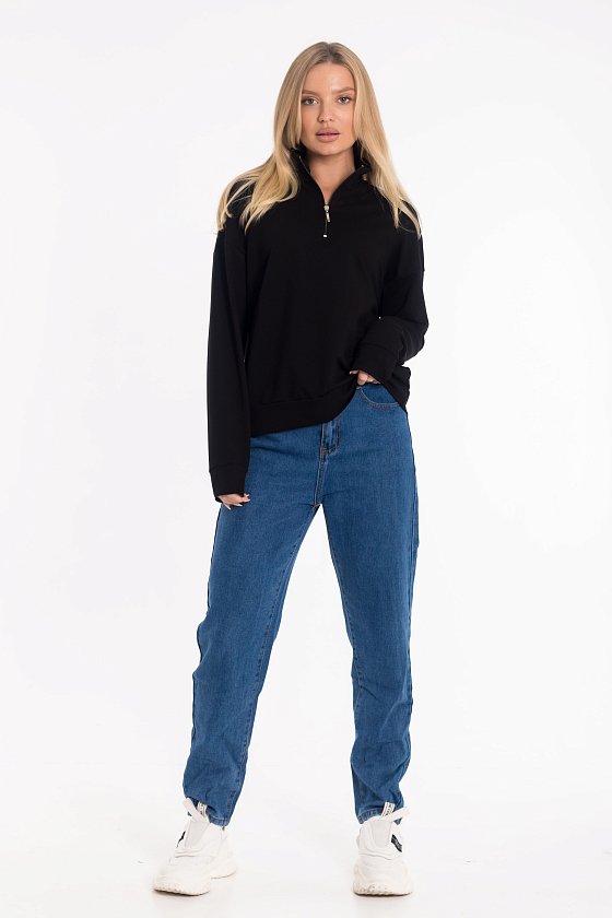 Стильная толстовка выполнена из футера двухнитки. Модель с удобной короткой застежкой на молнию и практичным воротником-стойкой, обеспечивающим дополнительное тепло и комфорт. Рукава дополнены манжетами из основного полотна. Низ изделия оформлен притачным поясом для аккуратной посадки.