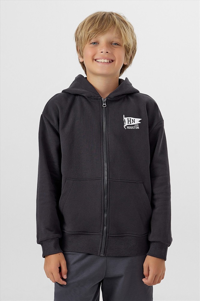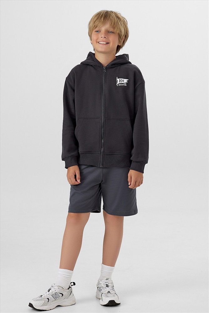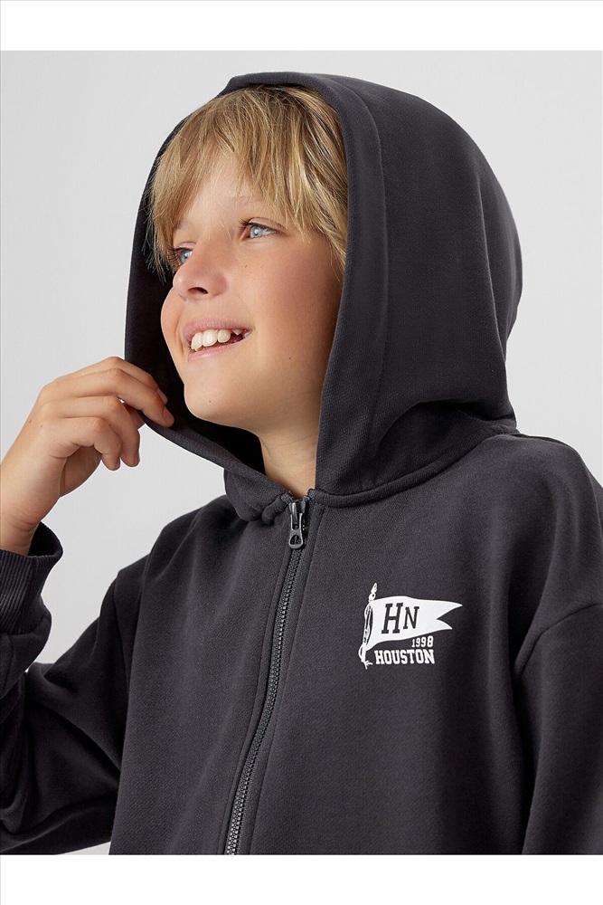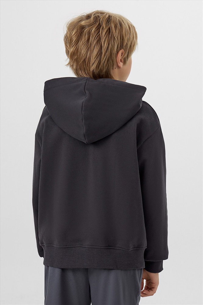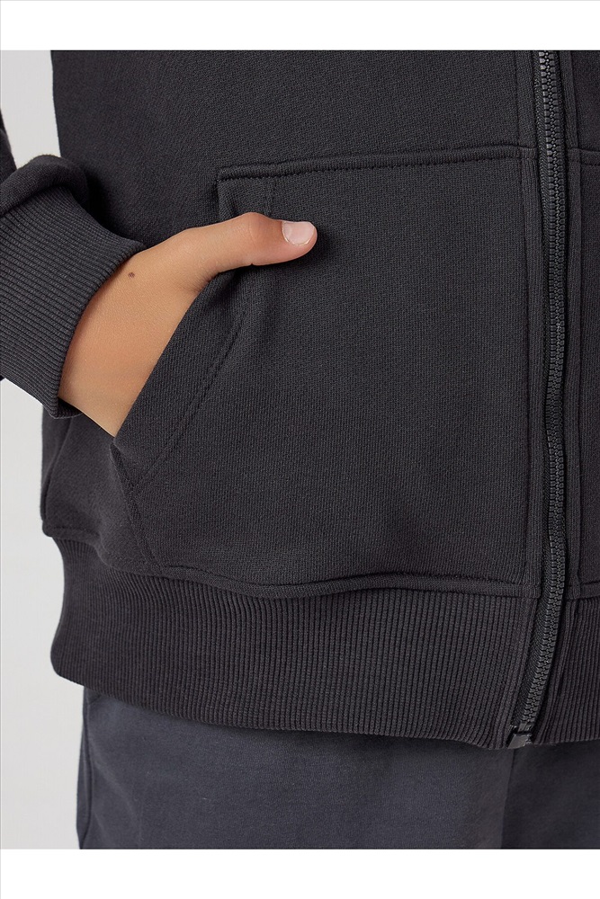 Жакет для мальчиков прямого силуэта с капюшоном. Капюшон на подкладке из основного полотна. Шов втачивания капюшона закрыт х/б тесьмой. Рукава втачные, линия плеча спущена. Притачные манжеты по низу рукавов и притачной пояс из рибаны. По переду застежка молния, карман кенгуру.